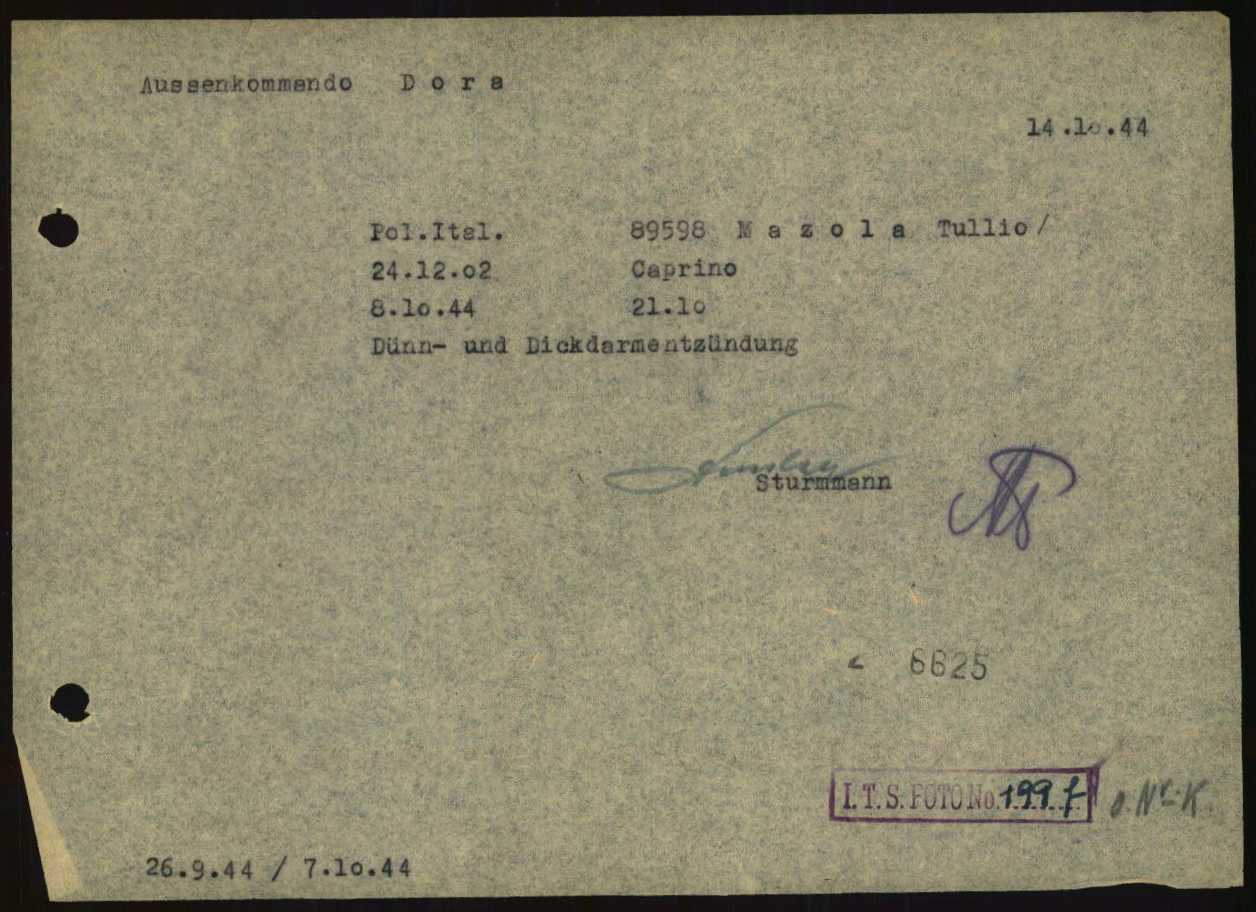 Documenti tratti da The Arolsen Archives online collections – 3203720 /Mazzola Tullio (Natzweiler), 6601113 / Mazzola Tullio (Buchenwald) e NUMERO / Mazzola Tullio (Mittelbau Dora).