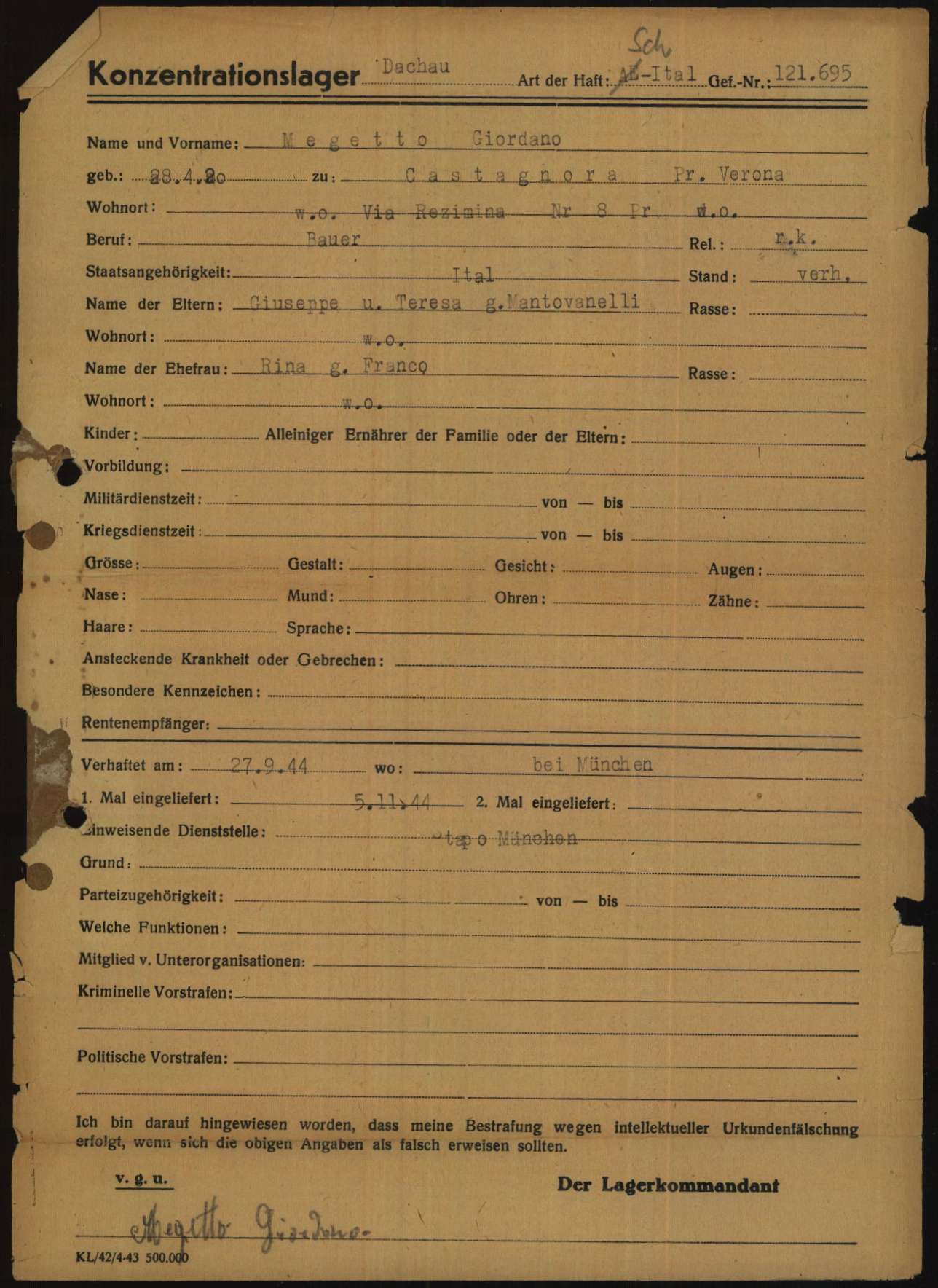 Megetto Giordano, figlio di Giuseppe e Teresa Mantovanelli, nasce a Menà di Castagnaro (Verona) il 29 aprile 1920. Di mestiere contadino, risiede a Castagnaro (Verona). Coniugato con Nella Mirandola e padre di quattro figli. Soldato del 18° Reggimento di Fanteria, IVa Compagnia, I° Battaglione, Plotone mortai. Posta Militare 412 (Divisione Acqui – Cefalonia – Grecia). Viene arrestato a Corfù il 28 settembre 1944 e detenuto ad Atene. Su disposizione della Stapo di Monaco di Baviera (Staatspolizei – Polizia di stato), viene deportato nel Campo di concentramento di Dachau. All’arrivo, il 5 novembre 1944, gli viene dato il numero di matricola 121695 e viene classificato come deportato per motivi precauzionali (SCH – Schutzhäftlinge), per poi essere assegnato al Blocco 2. Viene liberato a Dachau.