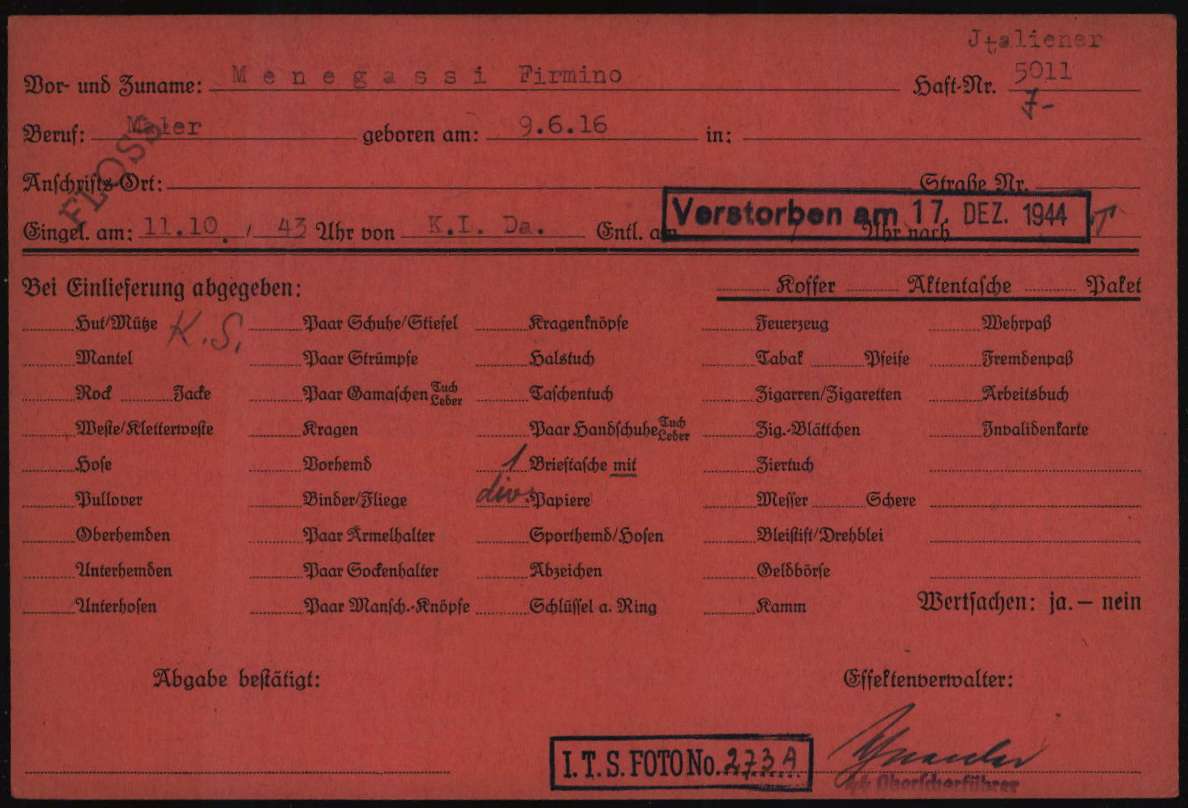 Documenti tratti da The National Archives and Records Administration (NARA Washington) – Volume IA/4 8: September 1943 (First Date: [Illegible]-September-1943) – Menegazzi o Menegassi Firmino – Fold3 File #232634850 – Image provided by Fold3 e da The Arolsen Archives online collections – 10946064 / Menegazzi o Menegassi Firmino (Flossenbürg).