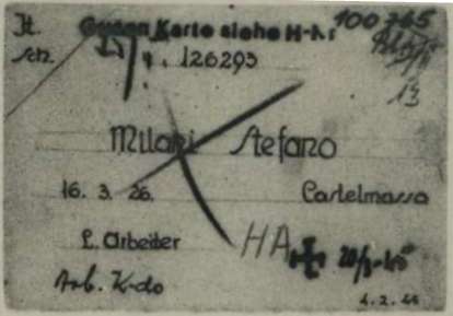 Milani Stefano, figlio di Gaetano, nasce a Massa Superiore – frazione di Castelmassa (Rovigo) il 16 marzo 1926. Di mestiere agricoltore, risiede a Villa Bartolomea (Verona). Viene arrestato a Villa Bartolomea e poi trasferito nel Campo di concentramento e transito di Bolzano (Polizei – und Durchgangslager Bozen), dove gli viene assegnato il numero di matricola 8129. Su disposizione della Sipo di Verona (Sicherheitspolizei – Polizia di Sicurezza), viene deportato nel Campo di concentramento di Mauthausen il 1° febbraio 1945 (trasporto n° 119). All’arrivo, il 4 febbraio 1945, gli viene assegnato il numero di matricola 126293 e viene classificato come deportato per motivi precauzionali (SCH – Schutzhäftlinge). Viene trasferito a Gusen (campo satellite di Mauthausen). Muore a Gusen il 20 marzo 1945 e viene sepolto nella stessa località in fossa comune.