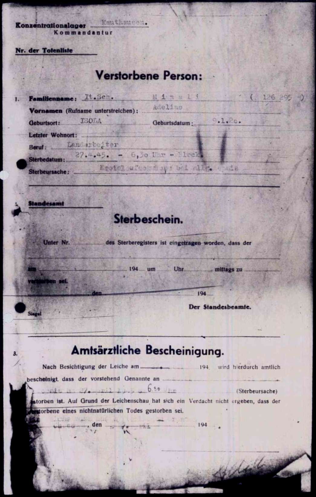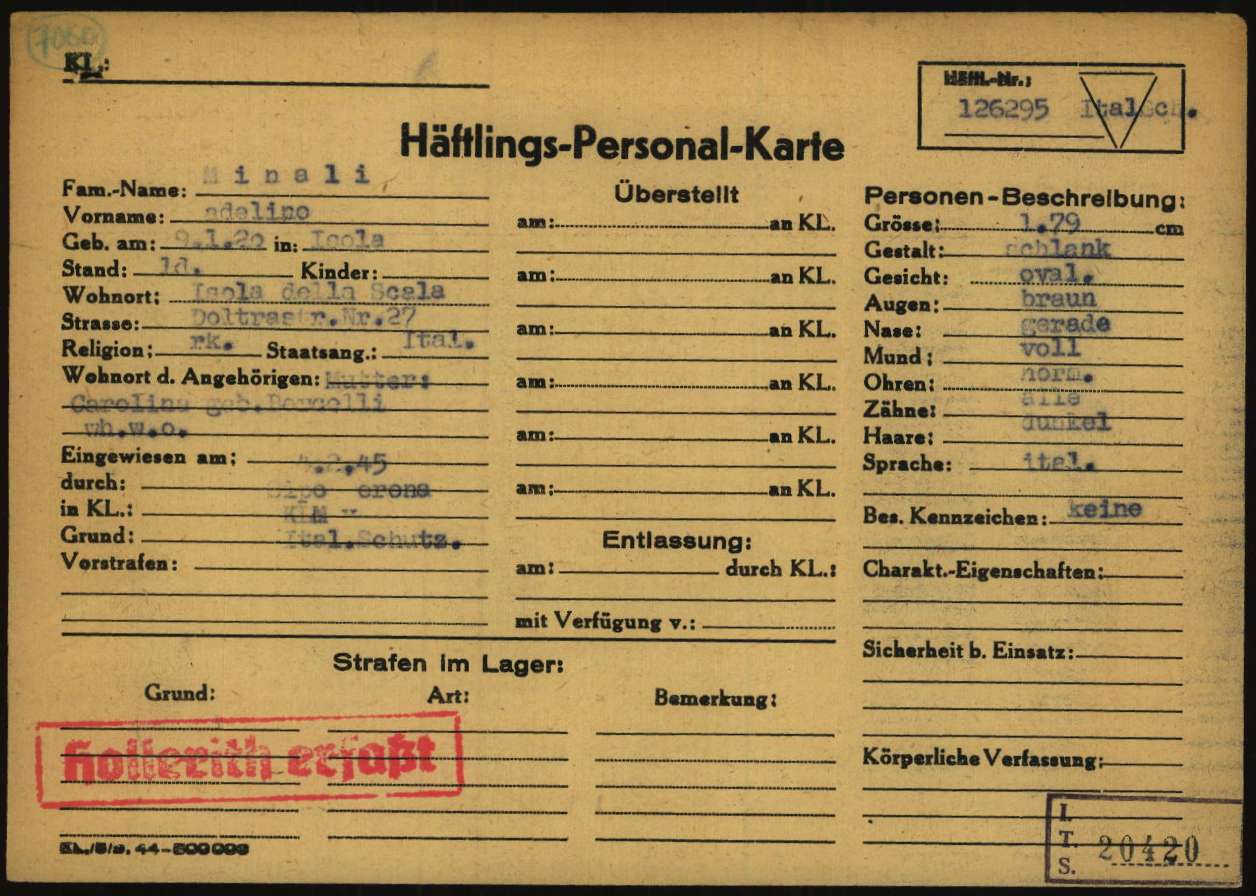 Documenti tratti da The Arolsen Archives online collections – 1633079 / Minali Adelino (Mauthausen) e 1633080 / Minali Adelino (Gusen).