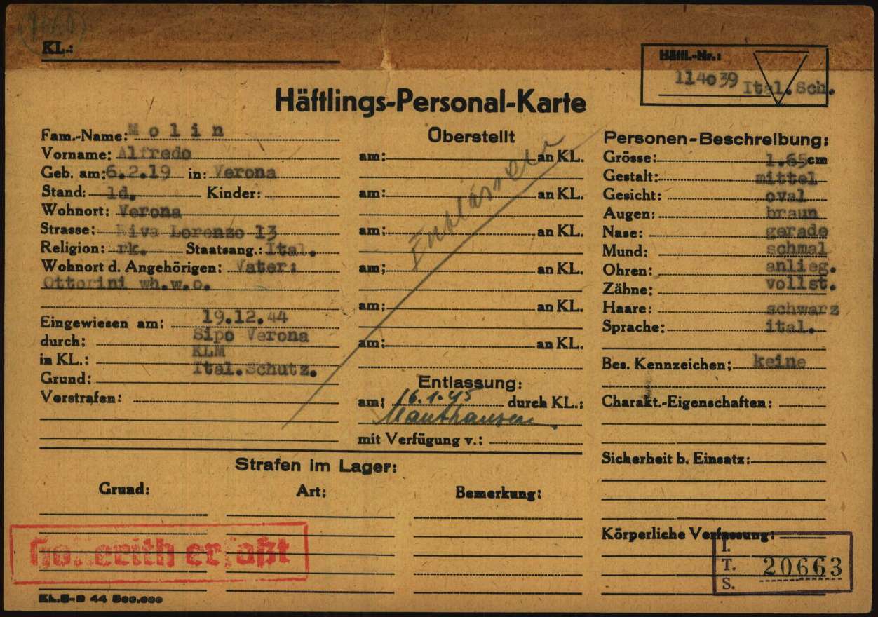 Documenti tratti da The Arolsen Archives online collections – 1637426 / Molin Alfredo (Mauthausen) e 70563359 / Molin Alfredo (Grosslager Linz-Wegscheid).