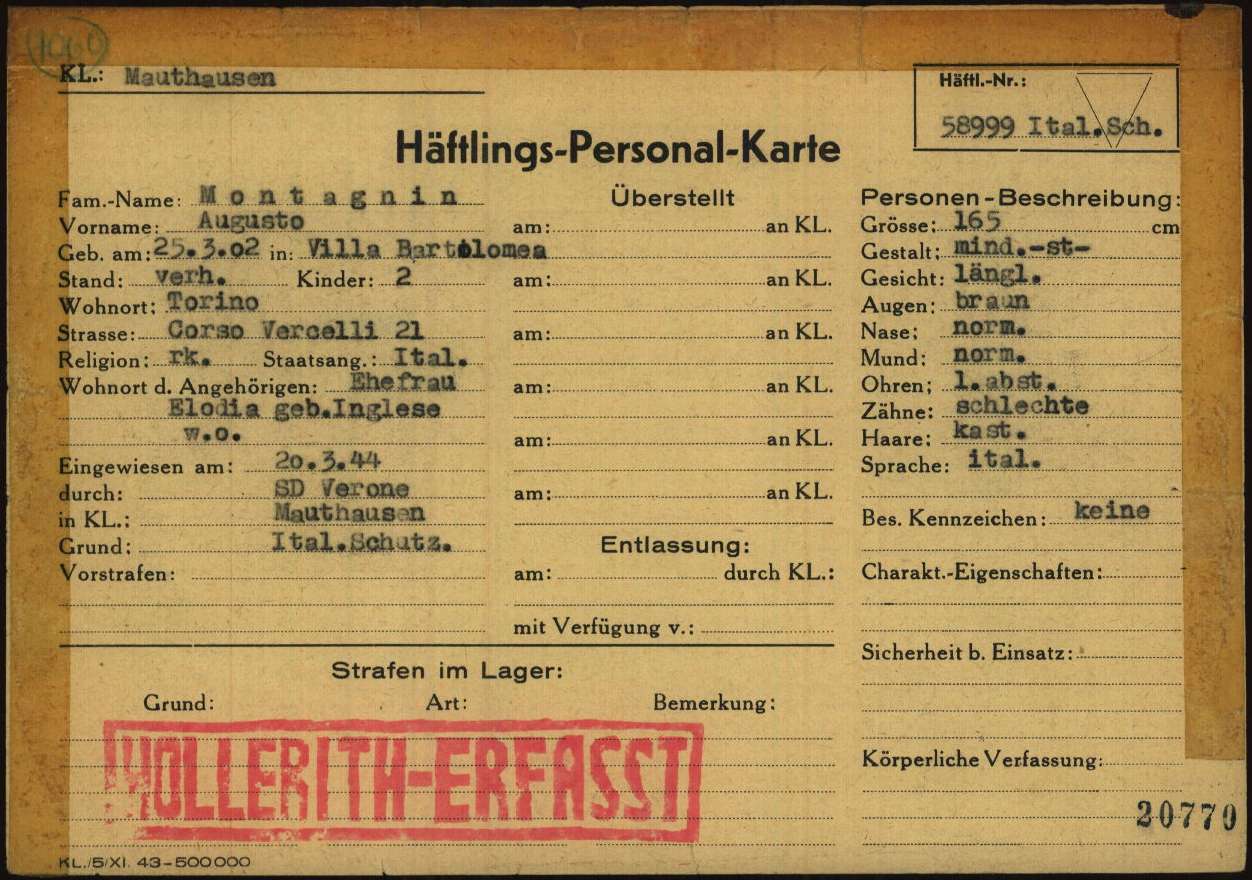 Montagnin Augusto, figlio di Giovanni, nasce a Villa Bartolomea (Verona) il 25 marzo 1902. Di mestiere operaio, risiede a Torino, è coniugato con Elodia Inglese e padre di due figli. Viene arrestato a Torino e su disposizione del SD di Verona (Sicherheitsdienst – Servizio di Sicurezza delle SS), viene deportato nel Campo di concentramento di Mauthausen sul convoglio partito da Bergamo il 16 marzo 1944 (trasporto n° 34). All’arrivo, il 20 marzo 1944, gli viene assegnato il numero di matricola 58999 e viene classificato come deportato per motivi precauzionali (SCH – Schutzhäftlinge). Il 21 agosto 1944 viene trasferito a Gusen (campo satellite di Mauthausen). Ricoverato presso l’infermeria di Mauthausen (Revier) il 15 marzo 1945, muore il 17 marzo 1945. All’inizio degli anni ’60 uno spazio all’interno del Memoriale di Mauthausen fu adibito a cimitero, nel quale vennero traslate le salme esumate sia dai «Cimiteri americani» di Mauthausen e Gusen, sia dalle fosse comuni allestite dalle SS. Nel settore II del Campo di Mauthausen e nella zona tra le baracche 16 e 19 furono sepolti oltre 14.000 Caduti, molti di questi di nazionalità italiana. Tra questi anche il Montagnin.