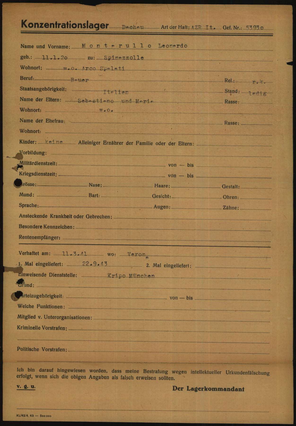 Montarullo Leonardo, nasce a Spinazzola (Bari) l’11 gennaio 1920. Celibe, risiede a Spinazzola. Viene arrestato a Verona l’11 marzo 1941 e detenuto nel Reclusorio militare di Peschiera del Garda (Verona). Su disposizione della Kripo di Monaco di Baviera (Kriminalpolizei – Polizia criminale), viene deportato nel Campo di concentramento di Dachau sul convoglio partito da Peschiera del Garda il 20 settembre 1943 (trasporto n° 2). All’arrivo, il 22 settembre 1943, gli viene assegnato il numero di matricola 53930 e viene classificato come deportato ai lavori forzati (AZR – Arbeitszwang Reich). Mestiere dichiarato all’atto dell’immatricolazione (o mestiere assegnato nel campo): contadino. Viene trasferito a Fischen (campo satellite dipendente da Dachau), dove viene liberato il 22 aprile 1945.