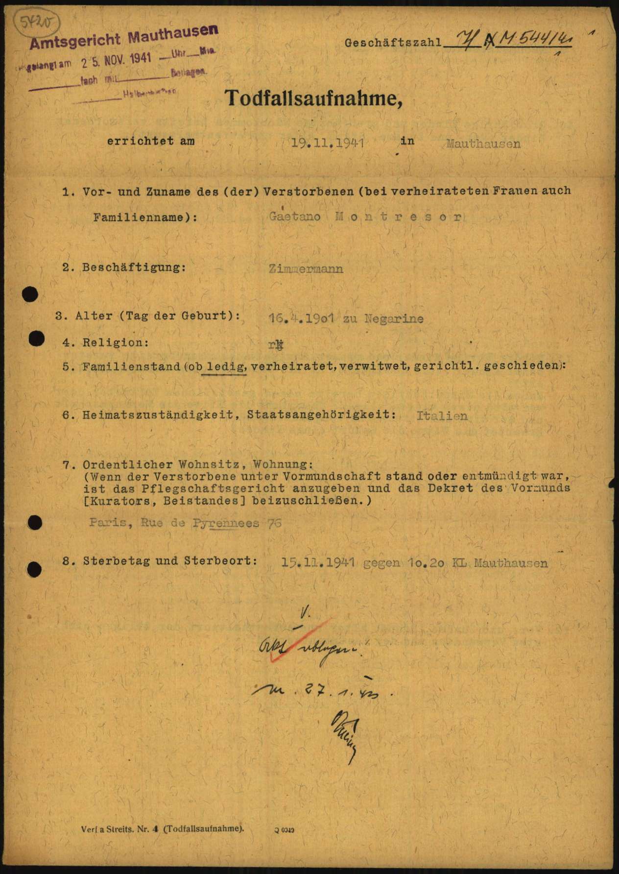 Documenti tratti da The Arolsen Archives online collections – 1638808 / Montresor Gaetano (Mauthausen).