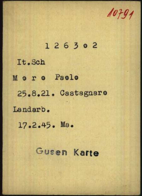 Moro Paolo, figlio di Giuseppe e Virginia Ragoso, nasce a Castagnaro (Verona) il 25 agosto 1921. Di mestiere agricoltore, risiede a Villa Bartolomea (Verona) ed è celibe. Viene arrestato a Villa Bartolomea il 1° dicembre 1944 e detenuto, prima a Legnago (Verona) e poi a Verona nel Forte di San Leonardo. Viene poi trasferito nel Campo di concentramento e transito di Bolzano (Polizei – und Durchgangslager Bozen) il 15 dicembre 1944. Su disposizione della Sipo di Verona (Sicherheitspolizei – Polizia di Sicurezza), viene deportato nel Campo di concentramento di Mauthausen il 1° febbraio 1945 (trasporto n° 119). All’arrivo, il 4 febbraio 1945, gli viene assegnato il numero di matricola 126302 e viene classificato come deportato per motivi precauzionali (SCH – Schutzhäftlinge). Il 17 febbraio 1945 viene trasferito a Gusen (campo satellite di Mauthausen). Viene liberato dai soldati dell’Esercito americano a Gusen il 5 maggio 1945 e rimpatriato il 25 giugno 1945.