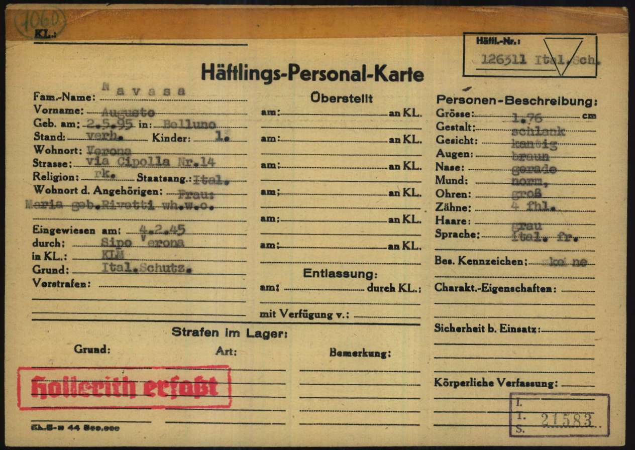 Navasa Augusto, figlio di Francesco, nasce a Belluno il 2 maggio 1895. Di mestiere direttore dei telefoni, risiede a Verona, è coniugato con Maria Rivetti e padre di un figlio (Milo Navasa). Viene arrestato a Verona il 14 dicembre 1944 e detenuto, prima presso il Palazzo INA (sede del Comando Generale SS e Polizia di Sicurezza – Befehlshaber der Sicherheitspolizei und des Sicherheitsdienst / B.d.S Italien) e poi nel Forte San Leonardo e nel Forte San Mattia. Viene successivamente trasferito nel Campo di concentramento e transito di Bolzano (Polizei – und Durchgangslager Bozen). Su disposizione della Sipo di Verona (Sicherheitspolizei – Polizia di Sicurezza), viene deportato nel Campo di concentramento di Mauthausen il 1° febbraio 1945 (trasporto n° 119). All’arrivo, il 4 febbraio 1945, gli viene assegnato il numero di matricola 126311 e viene classificato come deportato per motivi precauzionali (SCH – Schutzhäftlinge). Il 17 febbraio 1945 viene trasferito a Gusen (campo satellite di Mauthausen). Muore a Gusen il 12 marzo 1945 e viene sepolto nella stessa località in fossa comune.