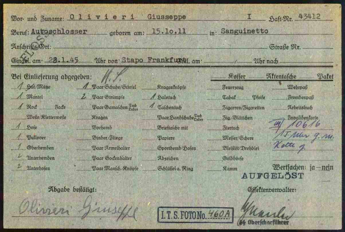 Documenti tratti da The Arolsen Archives online collections – 10963168 / Olivieri Giuseppe (Flossenbürg).