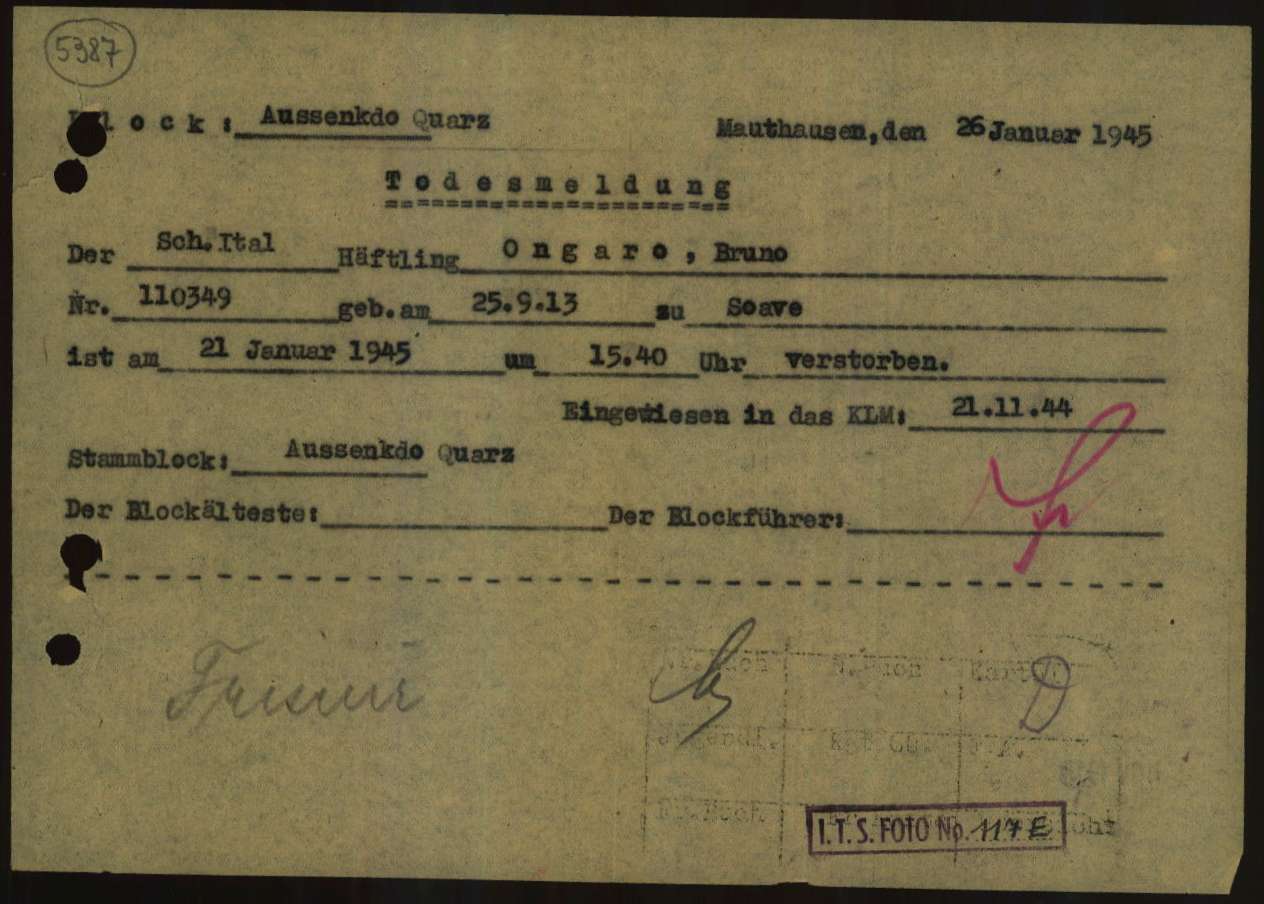 Documenti tratti da The Arolsen Archives online collections – 1663411 / Ongaro Bruno (Melk) e da The National Archives and Records Administration (NARA) – Ongaro Bruno / Registro dei decessi – #268300056, Image provided by Fold3.