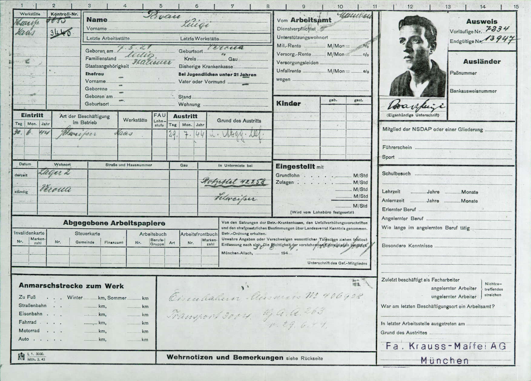 Pavan Luigi, nasce a San Michele Extra (Verona) il 7 maggio 1921. Celibe, risiede a San Michele Extra. Viene arrestato a Verona il 21 giugno 1944 e detenuto a Soave (Verona). Viene portato in Germania come lavoratore coatto, dove arriva il 30 giugno 1944. Viene impiegato presso la Fabbrica Krauss-Maffei AG di Monaco di Baviera (numero di documento provvisorio 7334 – numero di documento definitivo 13947) e vi rimane fino al 29 luglio 1944. Viene poi arrestato a Kochel (Germania) e deportato nel Campo di concentramento di Dachau. All’arrivo, il 3 agosto 1944 gli viene assegnato il numero di matricola 84254 e viene classificato come deportato per motivi precauzionali (SCH – Schutzhäftlinge). Viene poi trasferito a Leitmeritz (campo satellite di Flossenbürg) dove arriva il 2 febbraio 1945. Viene immatricolato con il numero 45384 e gli viene assegnata la categoria di lavoratore civile (ZA – Zivilarbeiter). Viene liberato il 23 marzo 1945.