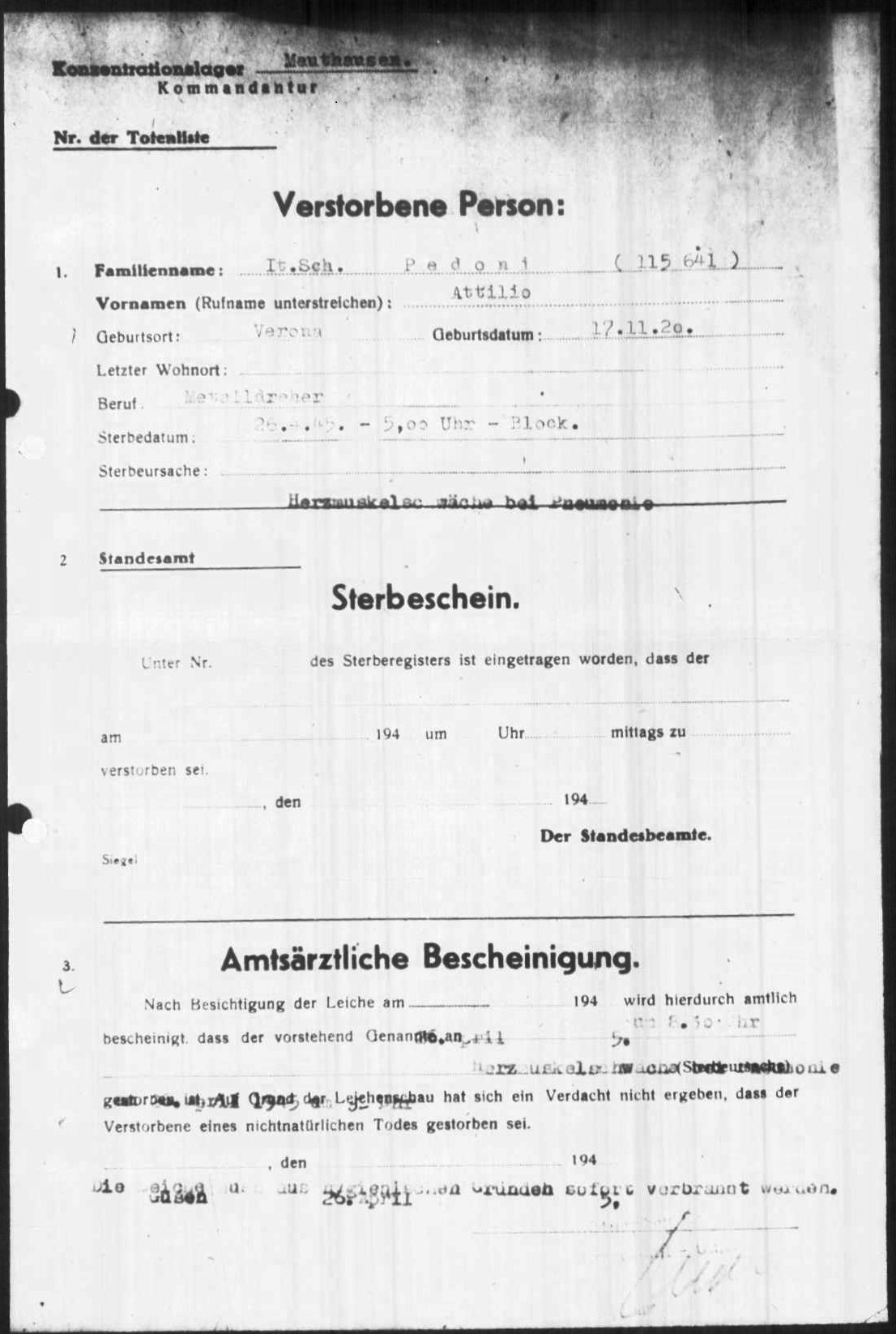 Documenti tratti da The Arolsen Archives online collections – 1678358 / Pedoni Attilio (Mauthausen) e 1678358 / Pedoni Attilio (Mauthausen).