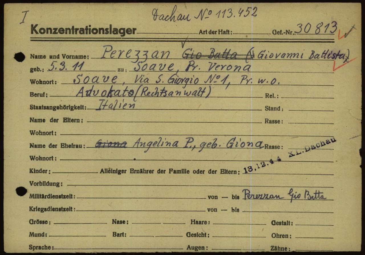Perezzan Giobatta o Giovanni Battista, nasce a Soave (Verona) il 5 marzo 1911. Di mestiere avvocato, risiede a Soave ed è coniugato con Angelina Giona. Viene arrestato dai nazifascisti a Soave (Verona) il 26 settembre 1944 e poi trasferito nel Campo di concentramento e transito di Bolzano (Polizei – und Durchgangslager Bozen). Su disposizione del BDS di Verona (Befehlshaber der Sicherheitspolizei und des SD – Comandante della Polizia di Sicurezza e Servizi di Sicurezza), viene deportato nel Campo di concentramento di Dachau il 5 ottobre 1944 (trasporto n° 90). All’arrivo, il 9 ottobre 1944, gli viene assegnato il numero di matricola 113452 e viene classificato come deportato per motivi precauzionali (SCH – Schutzhäftlinge). Viene poi trasferito a Buchenwald dove arriva il 13 dicembre 1944. Viene immatricolato con il numero 30813 e gli viene assegnata la categoria di deportato per motivi politici (POL – Politisch). Viene successivamente trasferito a Ohrdruf (campo satellite di Buchenwald) il 15 gennaio 1945 e immatricolato con il numero di matricola 2213/110323. Viene infine trasferito all’Aussenkommando S3 Olga (nome in codice di un progetto di tunnel per la costruzione di armi segrete – campo satellite di Buchenwald) il 20 dicembre 1944. Muore a Ohrdruf il 28 gennaio 1945 e viene sepolto a Ohrdruf in fossa comune.
