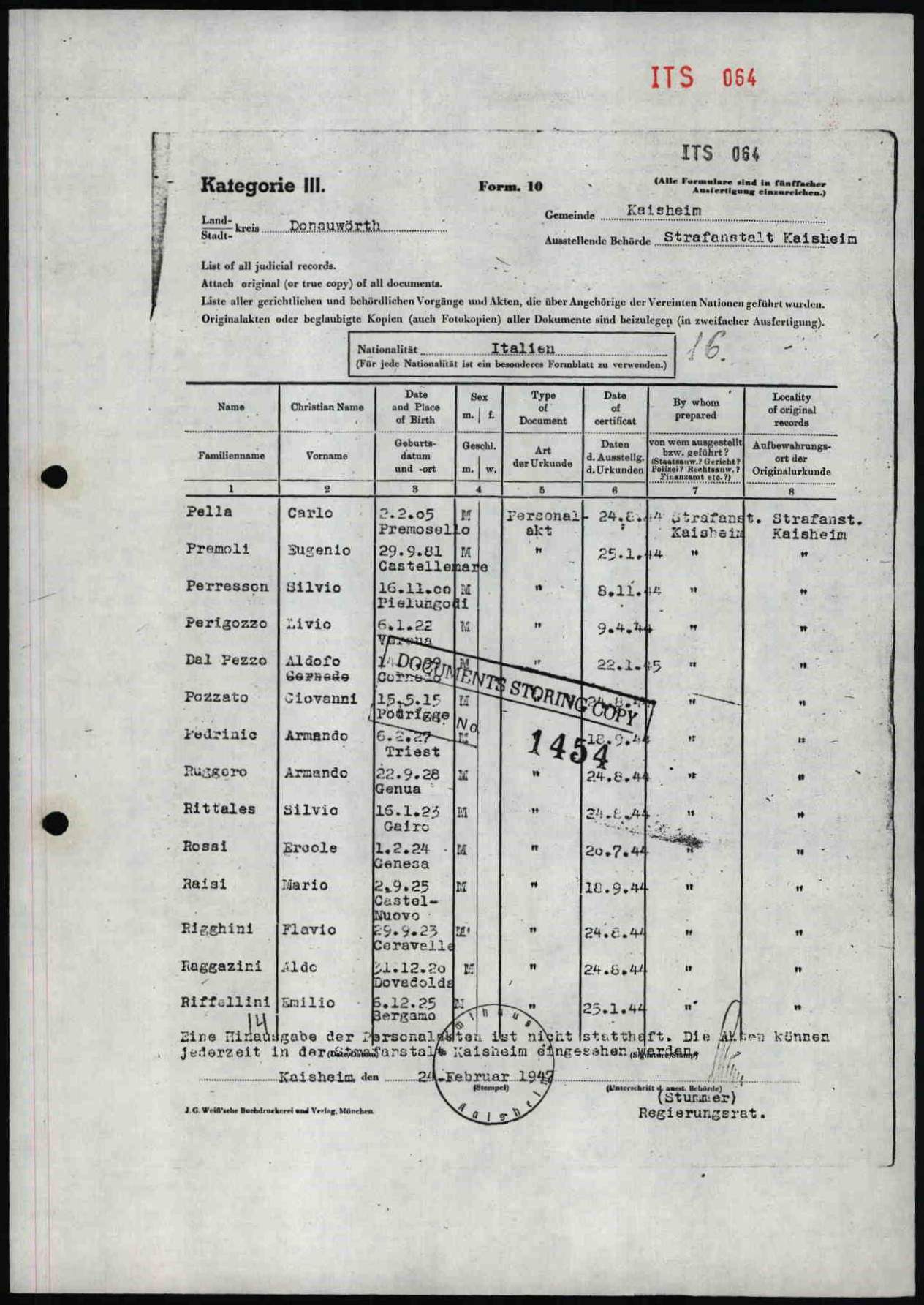Documenti tratti da The Arolsen Archives online collections – 11494093 / Perigozzo Livio (Prigione di Kaisheim).