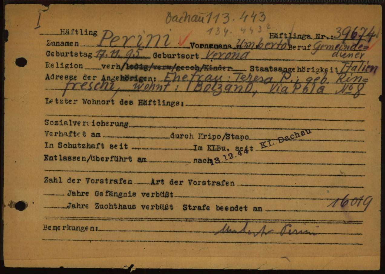 Perini Umberto, figlio di Gaetano e Adelaide Bentivoglio, nasce a Verona il 17 novembre 1895. Di mestiere sagrestano, risiede a Lacies (Bolzano), è coniugato con Teresa Rinfreschi e padre di tre figli. Viene arrestato a Laces il 7 dicembre 1943 e poi trasferito nel Campo di concentramento e transito di Bolzano (Polizei – und Durchgangslager Bozen). Su disposizione del BDS di Verona (Befehlshaber der Sicherheitspolizei und des SD – Comandante della Polizia di Sicurezza e Servizi di Sicurezza), viene deportato nel Campo di concentramento di Dachau il 5 ottobre 1944 (trasporto n° 90). All’arrivo, il 9 ottobre 1944, gli viene assegnato il numero di matricola 113443 e viene classificato come deportato per motivi precauzionali (SCH – Schutzhäftlinge). Viene poi trasferito a Buchenwald, dove arriva il 13 dicembre 1944 e dove gli viene assegnato il numero di matricola 39674. Infine viene trasferito all’Aussenkommando S3 Olga (nome in codice di un progetto di tunnel per la costruzione di armi segrete – campo satellite di Buchenwald) il 20 dicembre 1944. Muore a Buchenwald il 31 dicembre 1944.