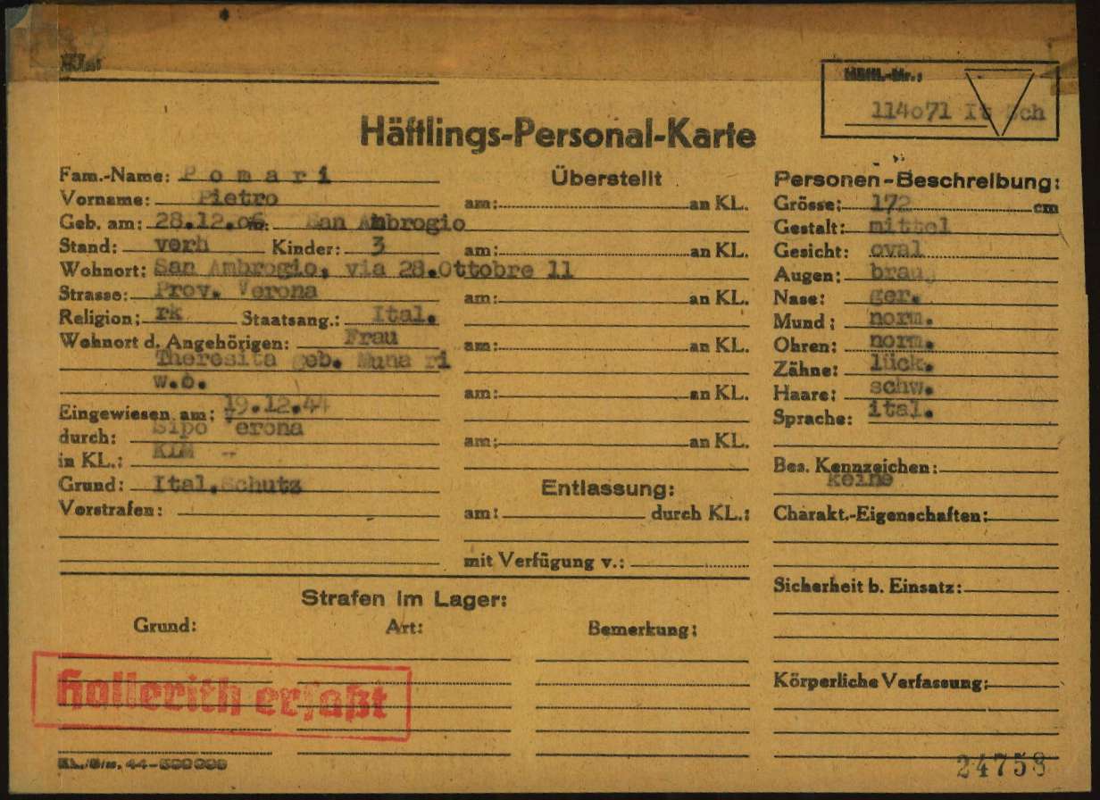Pomari Pietro, figlio di Giuseppe e Amabile Borchia, nasce a Sant’Ambrogio di Valpolicella (Verona) il 28 dicembre 1906. Di mestiere ferroviere, risiede a Sant’Ambrogio, è coniugato con Teresita Munari e padre di tre figli. Viene arrestato a Sant’Ambrogio il 14 ottobre 1944 e detenuto nella caserma delle Camicie Nere nei pressi del Teatro Romano (sede dell’Ufficio Politico Investigativo – U.P.I.). Viene poi trasferito nel Campo di concentramento e transito di Bolzano (Polizei – und Durchgangslager Bozen). Su disposizione della Sipo di Verona (Sicherheitspolizei – Polizia di Sicurezza), viene deportato nel Campo di concentramento di Mauthausen il 14 dicembre 1944 (trasporto n° 111). All’arrivo, il 19 dicembre 1944, gli viene assegnato il numero di matricola 114071 e viene classificato come deportato per motivi precauzionali (SCH – Schutzhäftlinge). Il 3 gennaio 1945 viene trasferito a Melk-Quarz (campo satellite di Mauthausen). Muore a Melk il 23 aprile 1945.