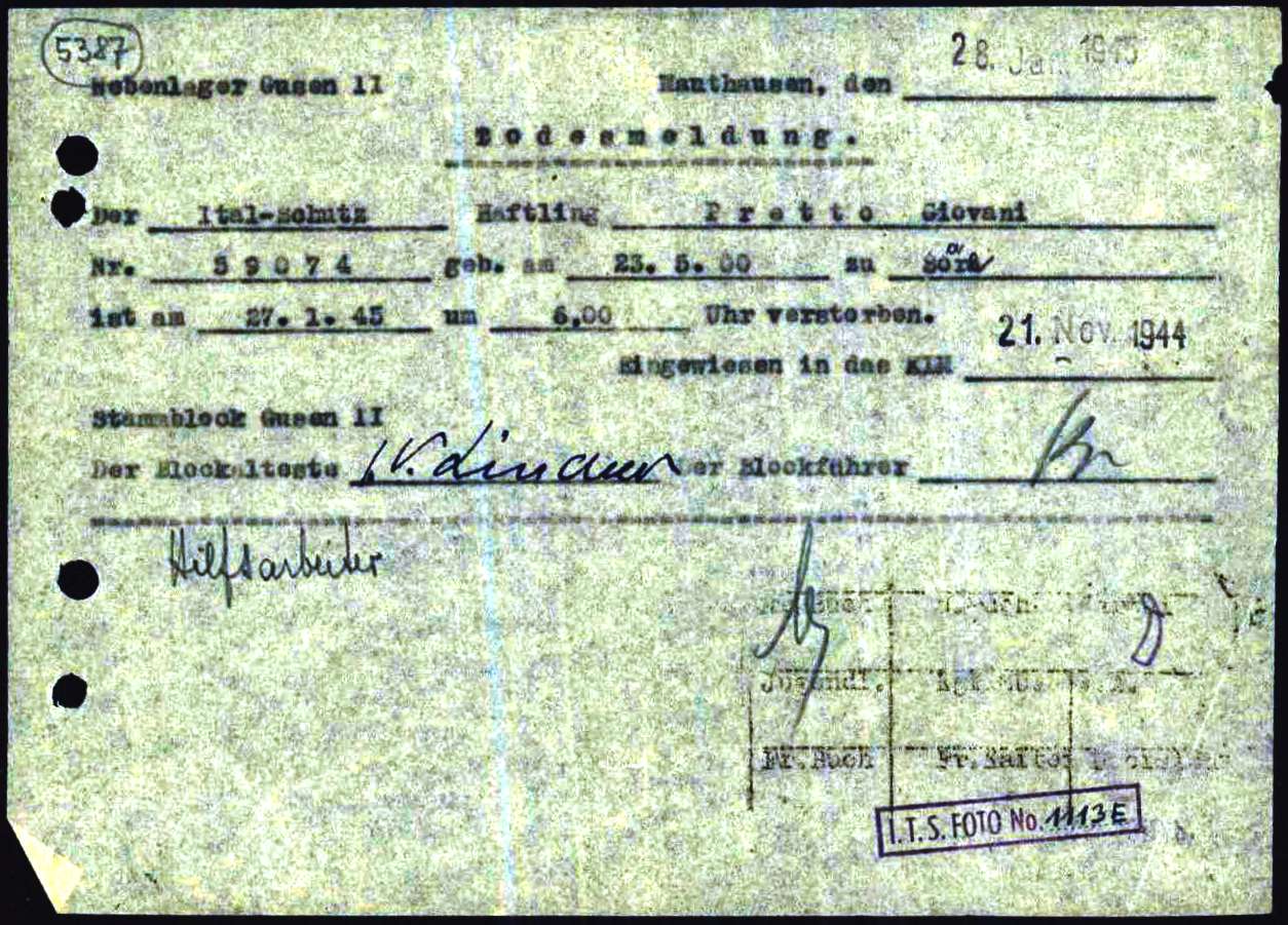 Documenti tratti da The Arolsen Archives online collections – 1701033 / Pretto Giovanni Carlo (Gusen).