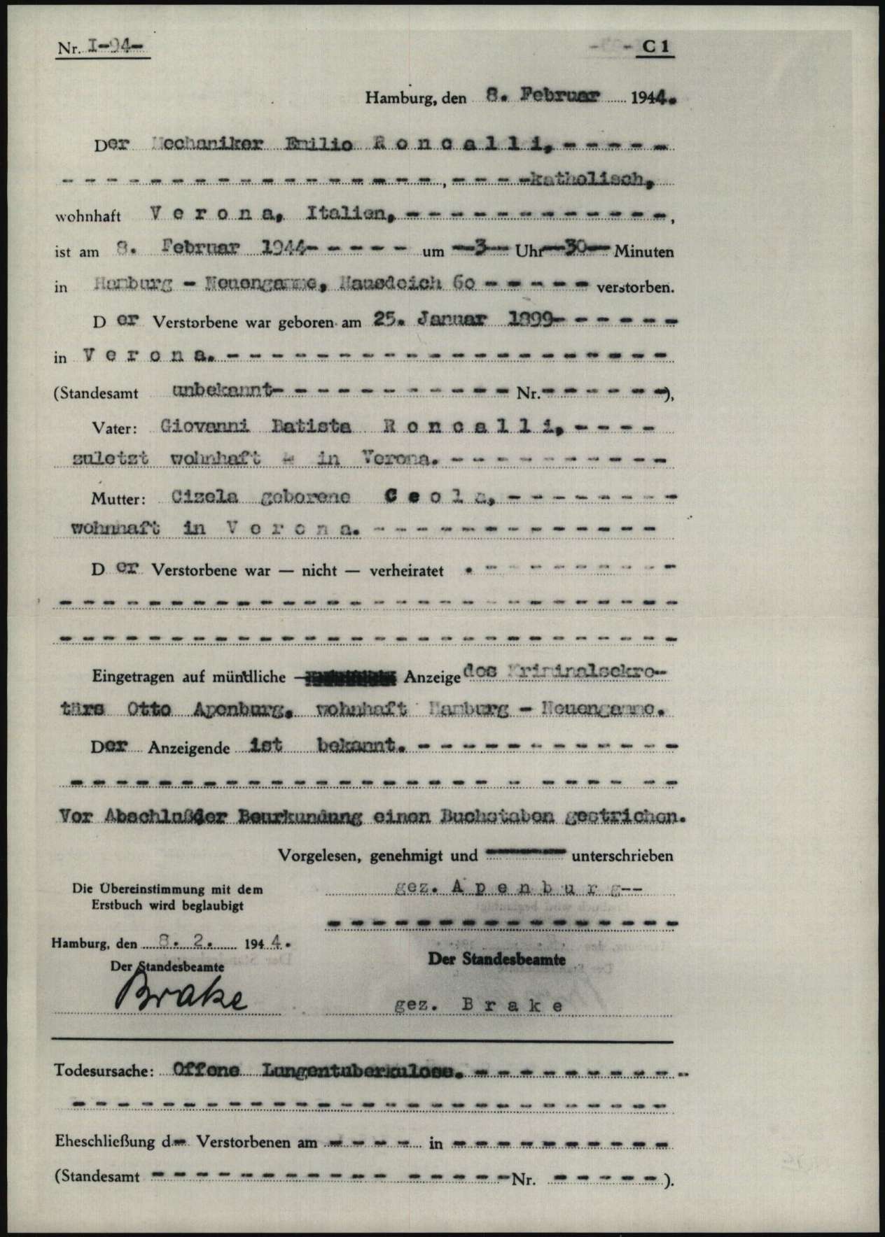 Roncalli Emilio, figlio di Giovanni Battista e Gisella Ceola, nasce a Verona il 25 gennaio 1899. Di mestiere meccanico, risiede a Verona. Dopo l’arresto, viene deportato nel Campo di concentramento di Neuengamme. All’arrivo, gli viene assegnato il numero di matricola 23609 e viene classificato come deportato perché reo abituale (BV – Berufbervrecher). Muore a Hamburg l’8 febbraio 1944.