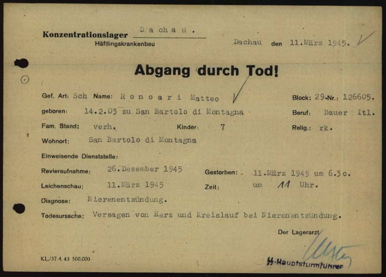 Roncari Matteo, nasce a San Bortolo di Selva di Progno (Verona) il 14 febbraio 1903. Di mestiere contadino, risiede nella frazione di San Bortolo delle Montagne ed è coniugato e padre di sette figli. Viene arrestato a Selva di Progno (Verona) e viene portato in Germania come lavoratore coatto. Il 4 settembre 1944 si trova ad Altötting (Baviera). Viene poi trasferito nel Campo di concentramento di Dachau. All’arrivo, il 17 novembre 1944, gli viene assegnato il numero di matricola 126605 e viene classificato come deportato per motivi precauzionali in campo di rieducazione al lavoro (SCH AEL – Schutzhäftlinge / Arbeitserziehungslager). Dopo l’immatricolazione, viene assegnato al Blocco 29. Il 26 dicembre 1945 viene ricoverato presso l’infermeria di Dachau (Revier). Trasferito in luogo ignoto il 31 dicembre 1944. Muore a Dachau l’11 marzo 1945.