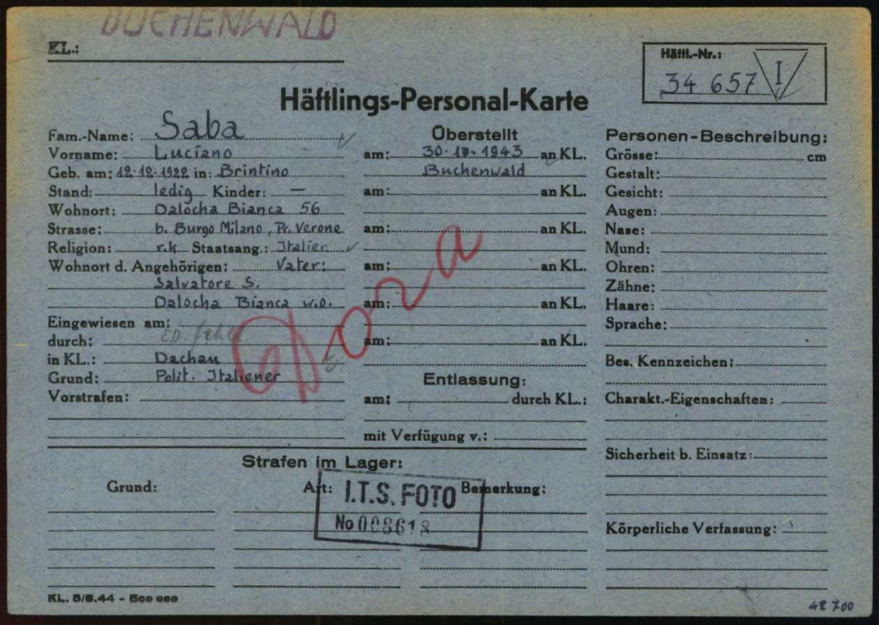 Saba Luciano, figlio di Salvatore e Pierina Bonomi, nasce a Brentino Belluno (Verona) il 12 dicembre 1912. Di mestiere lavoratore agricolo, risiede a Verona ed è celibe. Dopo l’arresto, viene detenuto nel Reclusorio militare di Peschiera del Garda (Verona). Su disposizione della Kripo di Monaco di Baviera (Kriminalpolizei – Polizia criminale), viene deportato nel Campo di concentramento di Dachau sul convoglio partito da Peschiera del Garda il 20 settembre 1943 (trasporto n° 2). All’arrivo, il 22 settembre 1943, gli viene assegnato il numero di matricola 55227 e viene classificato come deportato per motivi precauzionali (SCH – Schutzhäftlinge). Il 30 ottobre 1943, viene trasferito a Buchenwald, dove arriva il 31 ottobre 1943. Viene immatricolato con il numero 34657 e gli viene assegnata la categoria di deportato per motivi politici (POL – Politisch). Viene poi trasferito a Dora Mittelbau (campo satellite di Buchenwald) il 28 ottobre 1944, dove arrivato il 29 ottobre 1944 e gli viene assegnato il numero di matricola 36617. Viene liberato e ricoverato presso l’Ospedale italiano di Bomlitz presso Fallingbostel. Viene rimpatriato il 28 maggio 1945. Muore in ospedale a Merano il 1° gennaio 1946.