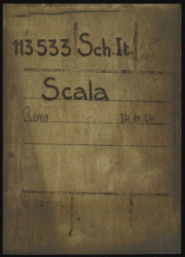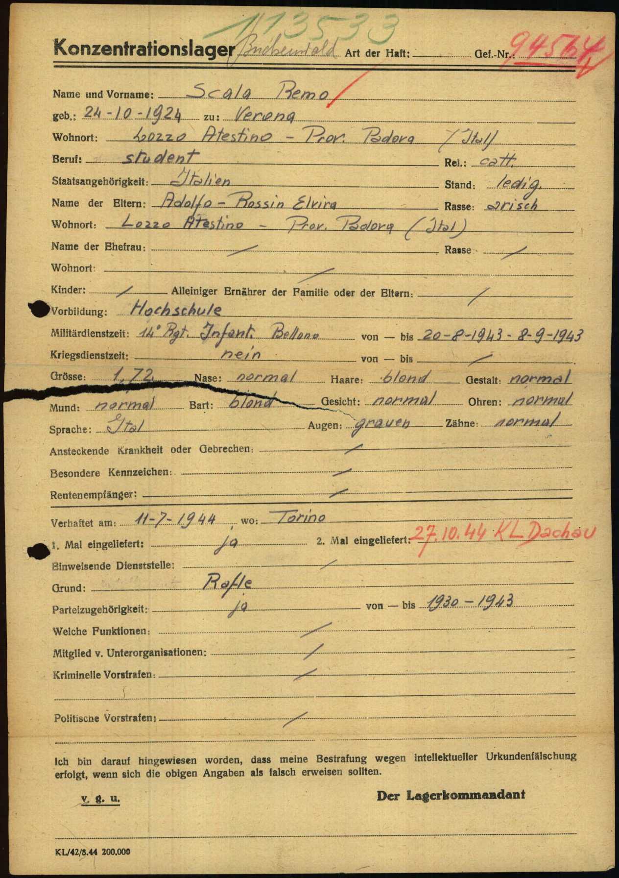 Scala Remo, figlio di Adolfo e Elvira Rossin, nasce ad Avesa – frazione di Verona il 24 ottobre 1924. Studente e meccanico, risiede a Lozzo Atestino (Padova) ed è celibe. Soldato del 14° Reggimento di Fanteria Belluno, viene arrestato a Torino l’11 luglio 1944. Detenuto a Torino, viene poi trasferito nel Campo di concentramento e transito di Bolzano (Polizei – und Durchgangslager Bozen). Su disposizione del BDS di Verona (Befehlshaber der Sicherheitspolizei und des SD – Comandante della Polizia di Sicurezza e Servizi di Sicurezza), viene deportato nel Campo di concentramento di Dachau il 5 ottobre 1944 (trasporto n° 90). All’arrivo, il 9 ottobre 1944, gli viene assegnato il numero di matricola 113533 e viene classificato come deportato per motivi precauzionali (SCH – Schutzhäftlinge). Il 27 ottobre 1944 viene trasferito a Gandersheim (campo satellite di Buchenwald) dove arriva il 30 ottobre 1944. Immatricolato il 18 novembre 1944, gli viene assegnato il numero 94564 e la categoria di deportato per motivi politici (POL – Politisch). Viene liberato a Bad Gandersheim il 4 aprile 1945.