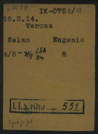 Selmo Eugenio, nasce a Veronella (Verona) il 16 febbraio 1914. Soldato del 2° Reggimento di Artiglieria (matricola militare 47907 – Distretto militare di Verona), viene arrestato a Merano (Bolzano) l’11 settembre 1943 e viene deportato nel Campo di concentramento di Dora. All’arrivo, il 5 maggio 1944, gli viene assegnato il numero di matricola 0754 e viene classificato come prigioniero di guerra (KGF – Kriegsgefangene). Il 4 maggio 1944 viene ricoverato presso l’infermeria di Dora (Revier), da dove viene dimesso il 28 maggio 1944. Viene liberato.