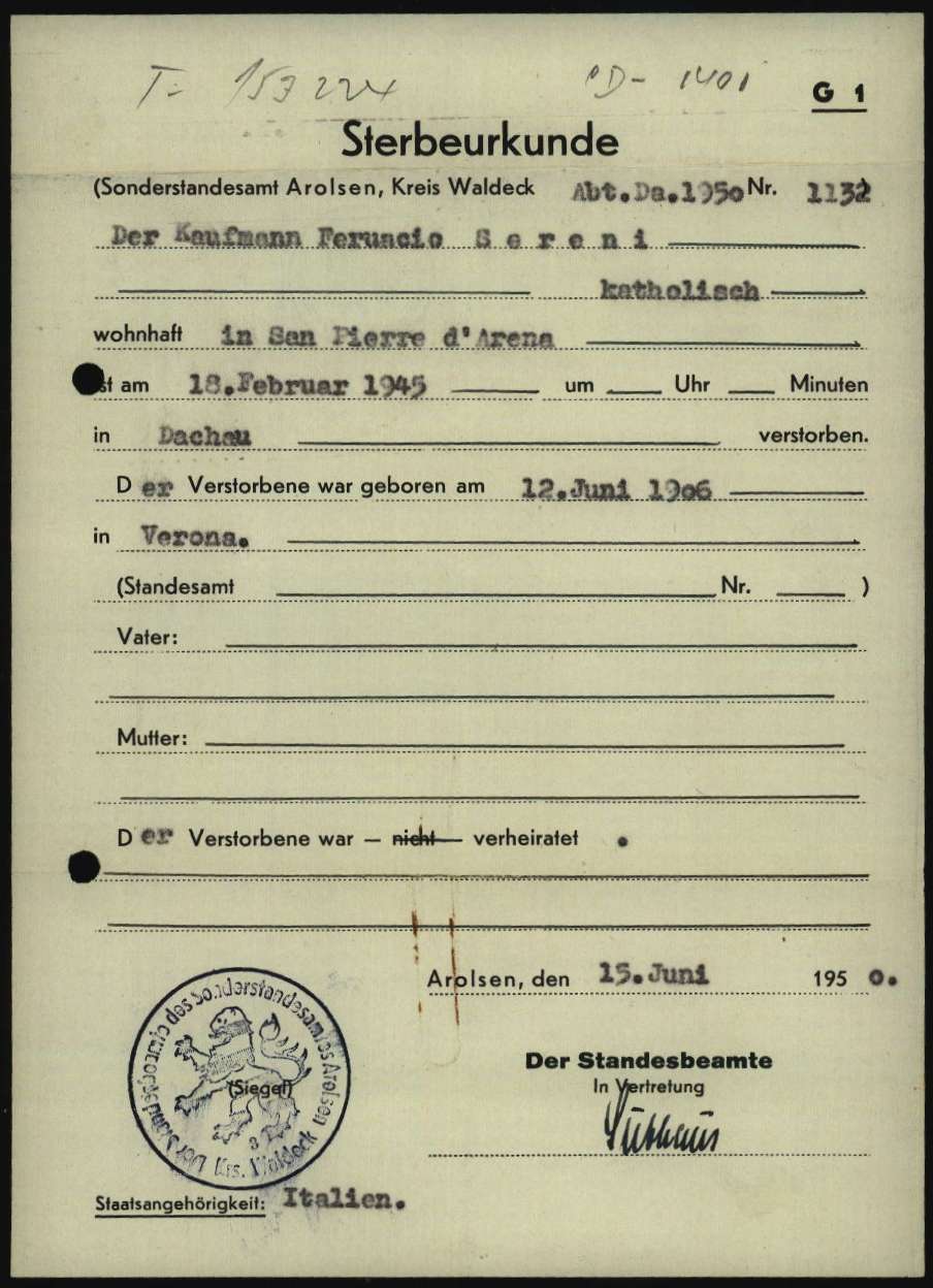Sereni Ferruccio, figlio di Frediano e Zuccali Caterina, nasce a Verona il 12 giugno 1906. Partigiano della Formazione partigiana C M R L. Di mestiere commerciante, risiede a Genova Sampierdarena ed è coniugato con Trenta Elena. Viene arrestato a Genova Sampierdarena e poi trasferito nel Campo di concentramento e transito di Bolzano (Polizei – und Durchgangslager Bozen). Su disposizione del BDS di Verona (Befehlshaber der Sicherheitspolizei und des SD – Comandante della Polizia di Sicurezza e Servizi di Sicurezza), viene deportato nel Campo di concentramento di Dachau il 5 ottobre 1944 (trasporto n° 90). All’arrivo, il 9 ottobre 1944, gli viene assegnato il numero di matricola 113553 e viene classificato come deportato per motivi precauzionali (SCH – Schutzhäftlinge). Muore a Dachau il 18 febbraio 1945 e viene sepolto a Dachau (Lager Friedhof) in fossa comune (cimitero del campo di concentramento Dachau-Leitenberg).