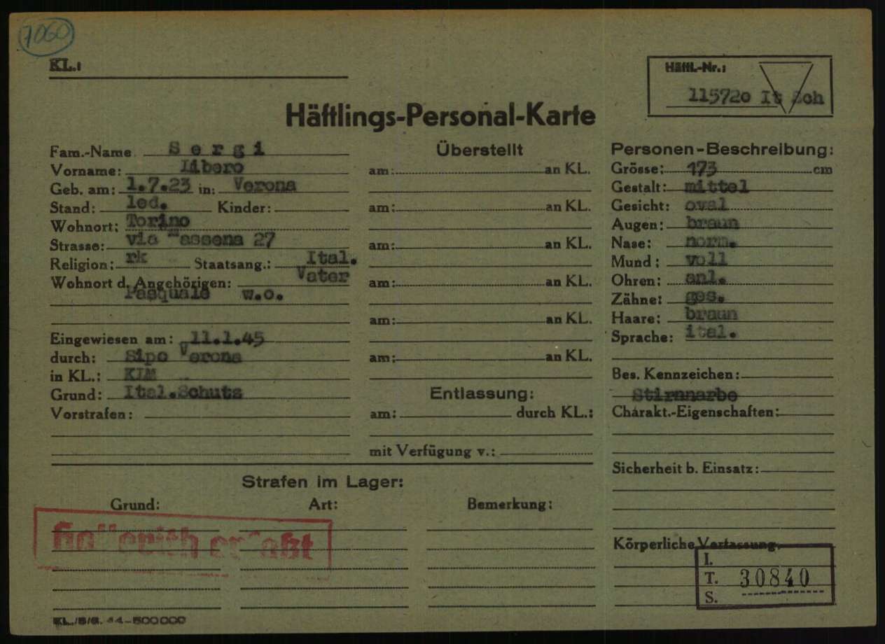 Sergi Libero, figlio di Pasquale, nasce a Verona il 1° luglio 1923. Di mestiere metalmeccanico, risiede a Torino ed è celibe. Dopo l’arresto, viene trasferito nel Campo di concentramento e transito di Bolzano (Polizei – und Durchgangslager Bozen). Su disposizione della Sipo di Verona (Sicherheitspolizei – Polizia di Sicurezza), viene deportato nel Campo di concentramento di Mauthausen l’8 gennaio 1945 (trasporto n° 115). All’arrivo, l’11 gennaio 1945, gli viene assegnato il numero di matricola 115720 e viene classificato come deportato per motivi precauzionali (SCH – Schutzhäftlinge). Il 16 febbraio 1945 viene trasferito a Gusen (campo satellite di Mauthausen). Viene liberato dai soldati dell’Esercito americano a Gusen il 5 maggio 1945.