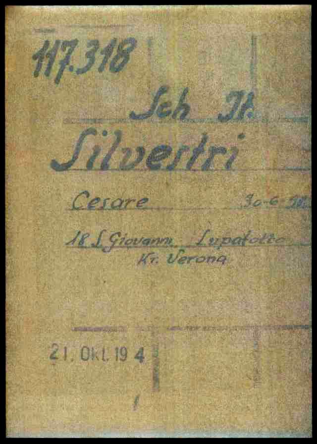 Silvestri Cesare, nasce a Bullach (Svizzera) il 30 giugno 1898. Di mestiere muratore, risiede a San Giovanni Lupatoto (Verona) ed è coniugato con Rosa Simbeni. Viene deportato nel Campo di concentramento di Dachau. All’arrivo, il 21 ottobre 1944, gli viene assegnato il numero di matricola 117318 e viene classificato come deportato per motivi precauzionali (SCH – Schutzhäftlinge). Il 12 dicembre 1944, viene trasferito a Buchenwald, dove arriva il 13 dicembre 1944. Viene immatricolato con il numero 110941 e gli viene assegnata la categoria di deportato per motivi politici (POL – Politisch). Viene poi trasferito a Ohrdruf (campo satellite di Buchenwald) il 15 gennaio 1945. Viene successivamente trasferito all’Aussenkommando S3 Olga (nome in codice di un progetto di tunnel per la costruzione di armi segrete – campo satellite di Buchenwald) il 20 dicembre 1944. Muore a Ohrdruf il 5 aprile 1945 e viene sepolto a Buchenwald (KZ Friedhof – cimitero del campo di concentramento) in fossa comune.