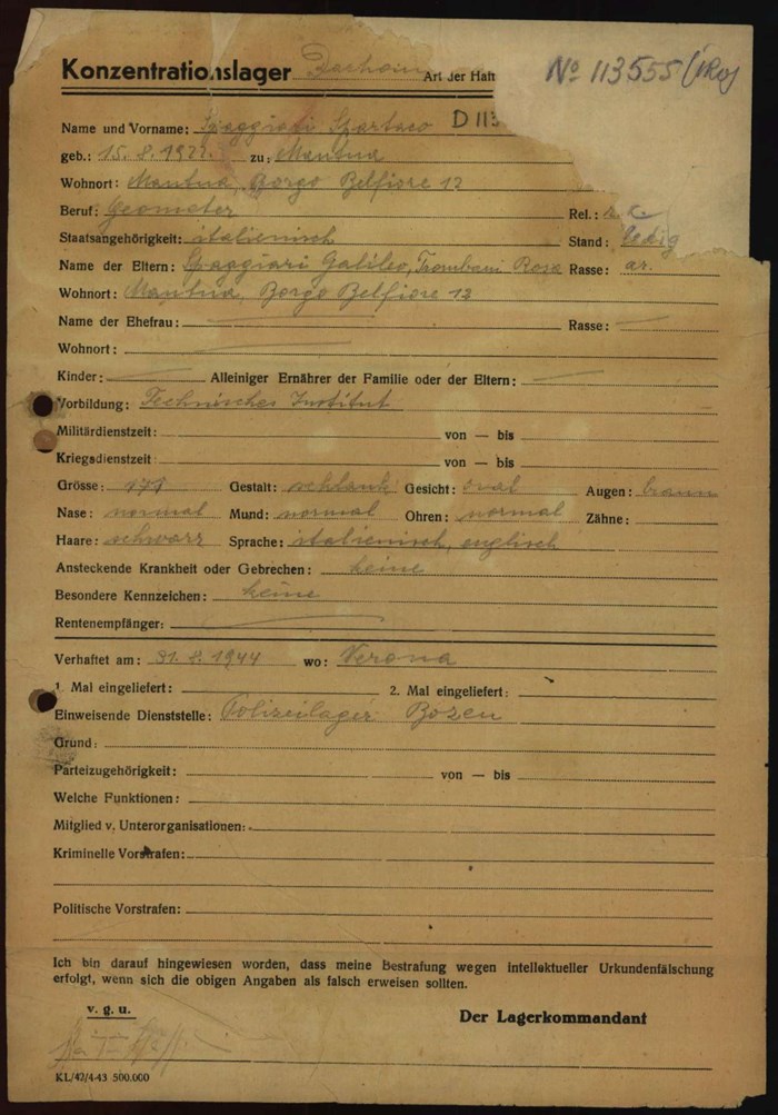 Spaggiari Spartaco, figlio di Galileo e Rosa Trombani, nasce a Mantova il 15 agosto 1922. Di mestiere geometra, risiede a Mantova ed è celibe. Viene arrestato a Verona il 31 agosto 1944, detenuto a Verona e poi trasferito nel Campo di concentramento e transito di Bolzano (Polizei – und Durchgangslager Bozen) il 14 settembre 1944, dove gli viene dato il numero di matricola 4114. Su disposizione del BDS di Verona (Befehlshaber der Sicherheitspolizei und des SD – Comandante della Polizia di Sicurezza e Servizi di Sicurezza), viene deportato nel Campo di concentramento di Dachau il 5 ottobre 1944 (trasporto n° 90). All’arrivo, il 9 ottobre 1944, gli viene assegnato il numero di matricola 113555 e viene classificato come deportato per motivi precauzionali (SCH – Schutzhäftlinge). Viene poi trasferito a Saulgau (campo satellite di Dachau). Viene liberato a Saulgau.