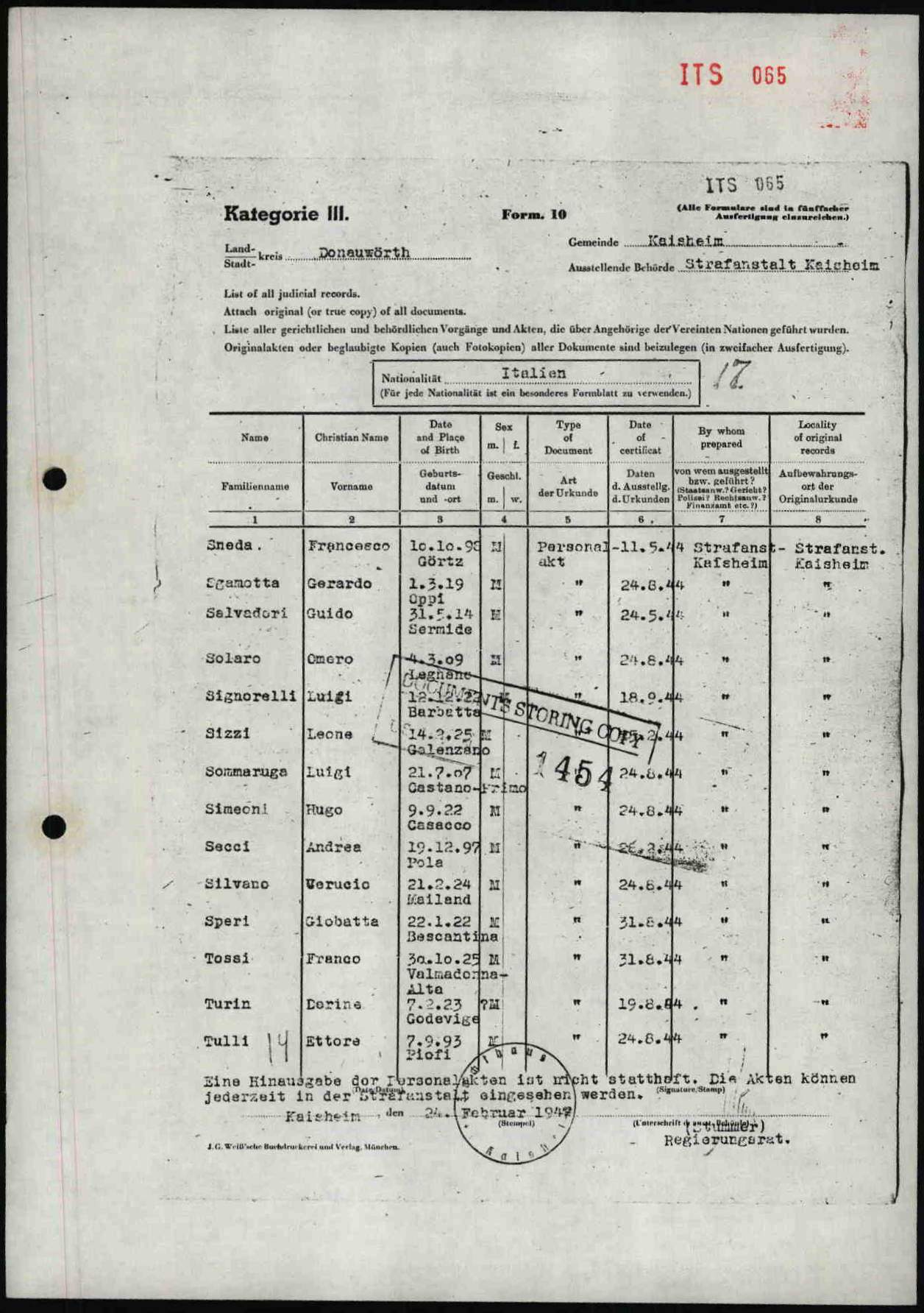 Documenti tratti da The Arolsen Archives online collections – 11494094 / Speri Giobatta o Giovanni (Prigione di Kaisheim).