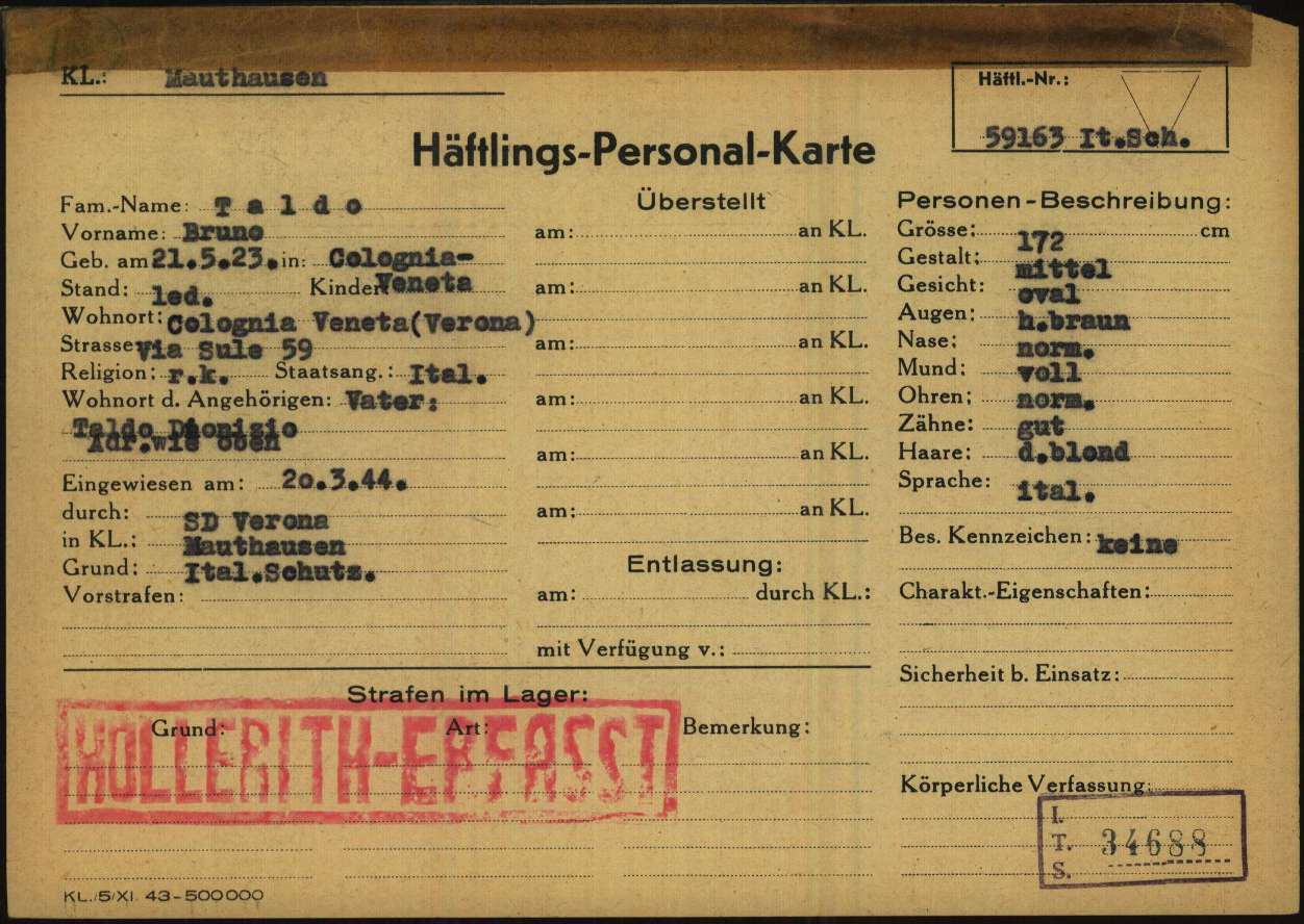 Taldo Bruno, figlio di Dionisio, nasce a Cologna Veneta (Verona) il 21 maggio 1923. Di mestiere meccanico per auto, risiede a Cologna Veneta ed è celibe. Viene arrestato a Torino e su disposizione del SD di Verona (Sicherheitsdienst – Servizio di Sicurezza delle SS), viene deportato nel Campo di concentramento di Mauthausen sul convoglio partito da Bergamo il 16 marzo 1944 (trasporto n° 34). All’arrivo, il 20 marzo 1944, gli viene assegnato il numero di matricola 59163 e viene classificato come deportato per motivi precauzionali (SCH – Schutzhäftlinge). Il 24 marzo 1944 viene trasferito a Gusen (campo satellite di Mauthausen). Viene poi trasferito a Schwechat (campo satellite di Mauthausen) il 16 aprile 1944. Viene liberato.