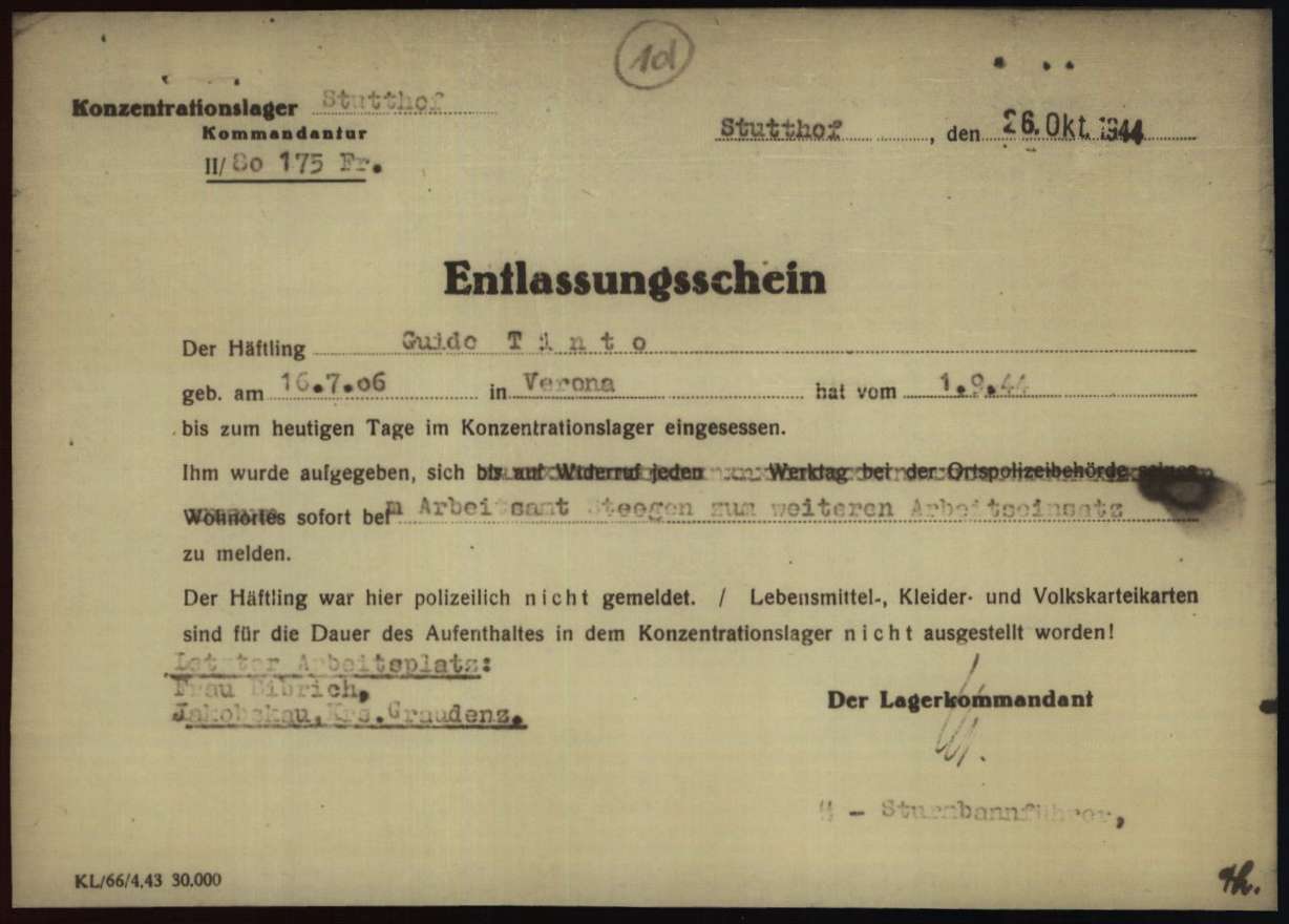 Tinto Guido, figlio di Italo e Domitilla Mantuanelli, nasce a Verona il 16 luglio 1906. Di mestiere contadino, risiede a Isola della Scala (Verona), è coniugato con Alma Boldrini e padre di cinque figli. Viene arrestato a Graudenz (in polacco Grudziądz – Polonia) l’8 luglio 1944. Su disposizione della Sipo di Bromberg – Germania – (Sicherheitspolizei – Polizia di Sicurezza), viene deportato nel Campo di concentramento di Stutthof. All’arrivo, il 1° settembre 1944, gli viene assegnato il numero di matricola 80175 e viene classificato come deportato perché renitente al lavoro. Rilasciato il 26 ottobre 1944.