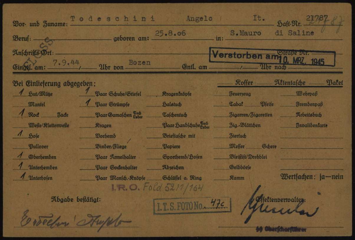 Todeschini Angelo, nasce a San Mauro di Saline (Verona) il 25 agosto 1906 ed è coniugato con Amalia Rama. Viene arrestato a San Mauro di Saline e poi trasferito nel Campo di concentramento e transito di Bolzano (Polizei – und Durchgangslager Bozen). Su disposizione della Sipo di Verona (Sicherheitspolizei – Polizia di Sicurezza), viene deportato nel Campo di concentramento di Flossenbürg il 5 settembre 1944 (trasporto n° 81). All’arrivo, il 7 settembre 1944, gli viene assegnato il numero di matricola 21787 e viene classificato come deportato per motivi precauzionali (SCH – Schutzhäftlinge). Muore a Flossenbürg il 10 marzo 1945 e viene sepolto a Flossenbürg nel Cimitero del campo di concentramento (Lager Friedhof) in fossa comune.
