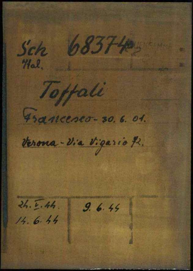 Toffolo o Toffali Francesco, nasce a Verona il 30 giugno 1901. Risiede a Verona e dopo l’arresto viene deportato nel Campo di concentramento di Dachau. All’arrivo, il 24 maggio 1944, gli viene assegnato il numero di matricola 68374 e viene classificato come deportato per motivi precauzionali (SCH – Schutzhäftlinge). Il 9 giugno 1944 viene trasferito in luogo ignoto. Viene poi trasferito a Dachau il 13 giugno 1944. Infine viene trasferito a Neuengamme il 22 ottobre 1944 con la categoria di deportato per motivi precauzionali (SCH – Schutzhäftlinge).