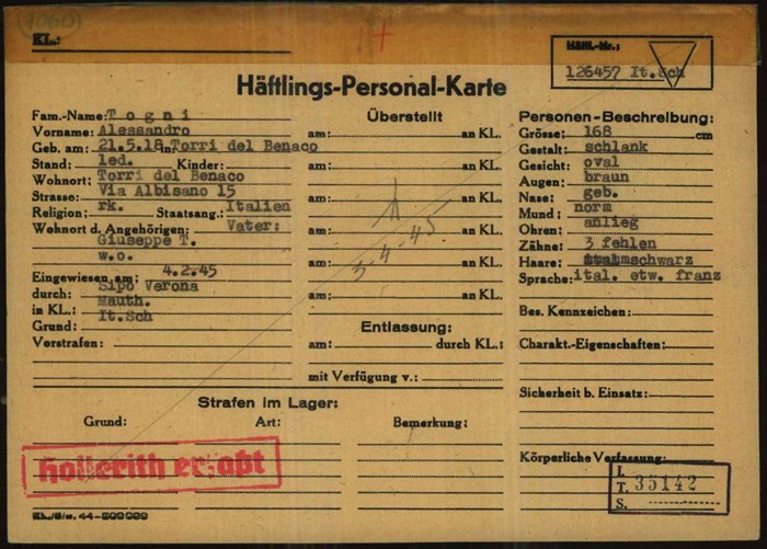 Documenti tratti da The Arolsen Archives online collections – 1807643 / Togni Alessandro (Mauthausen).