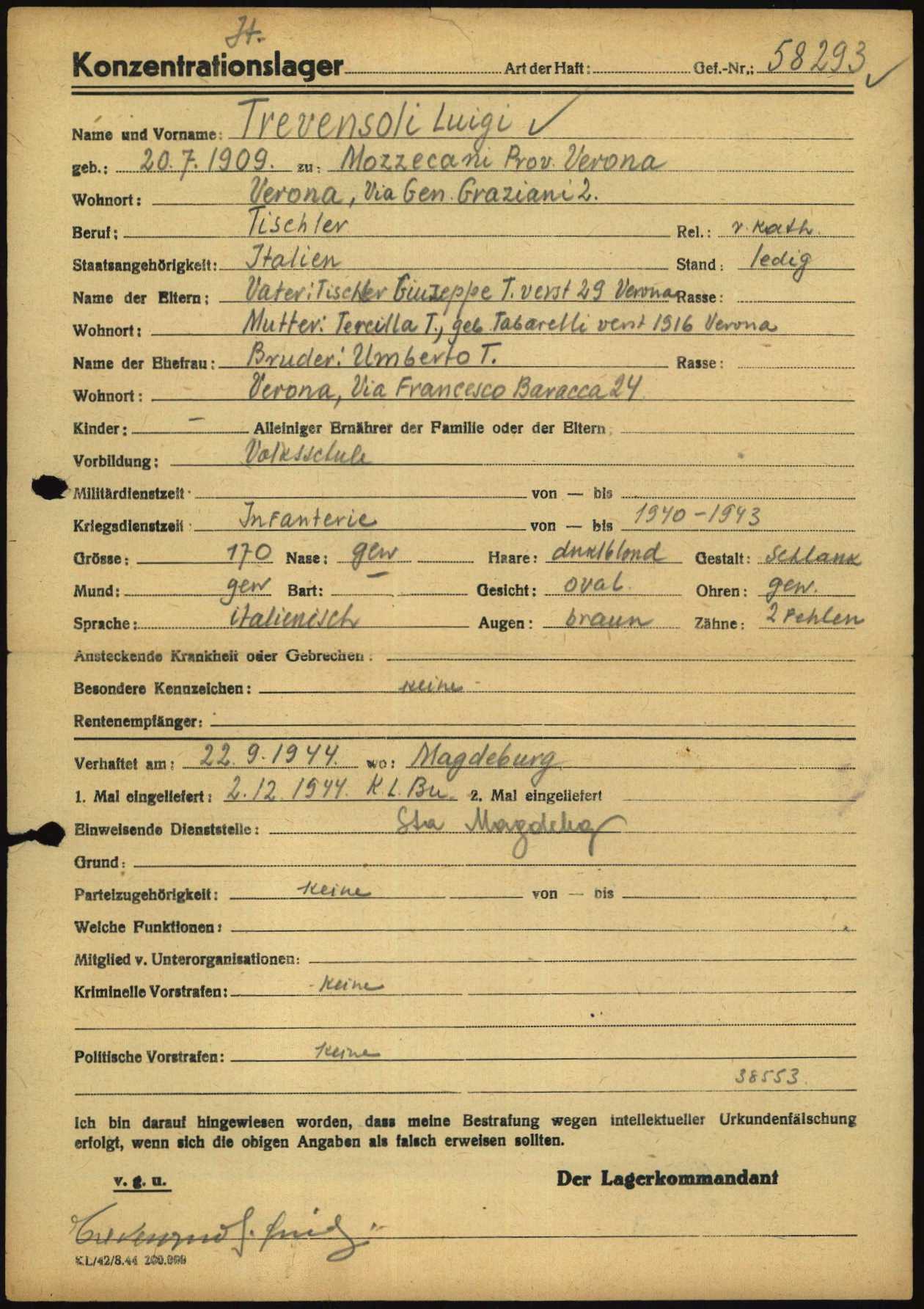 Trevenzuoli Luigi, figlio di Giuseppe e Tersilla Tabarelli, nasce a Mozzecane (Verona) il 28 luglio 1909. Di mestiere falegname o carpentiere, risiede a Verona ed è celibe. Dal 1° luglio del 1944 si trova in Germania (presumibilmente come lavoratore coatto), presso la Schäffer u. Budenberg G. m. b. H. di Magdeburgo / Buckau (fabbrica di manometri). Viene arrestato a Magdeburgo (Germania) il 22 settembre 1944. Su disposizione della Stapo di Magdeburgo (Staatspolizei – Polizia dello Stato), viene deportato nel Campo di concentramento di Buchenwald. All’arrivo, il 2 dicembre 1944, gli viene assegnato il numero di matricola 58293 e viene classificato come deportato per motivi politici (POL – Politisch). Viene poi trasferito a Langenstein-Zwieberge (campo satellite di Buchenwald). Muore ad Halberstadt il 2 aprile 1945 e viene sepolto a Langenstein in fossa comune.