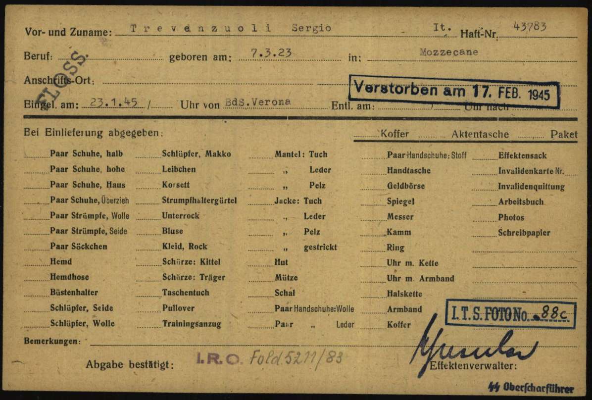 Documenti tratti da The Arolsen Archives online collections – 11029271 / Trevenzuoli o Trevenzoli Sergio (Flossenbürg).