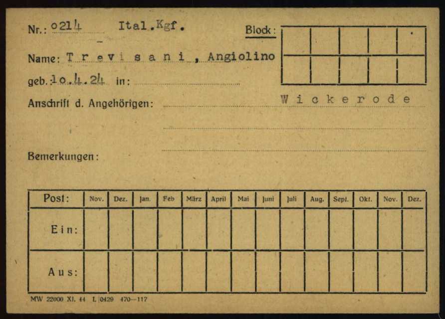 Trevisani Angiolino, nasce a Trevenzuolo (Verona) il 10 aprile 1924. Soldato. Viene arrestato a Udine e poi deportato nel Campo di concentramento di Dora Mittelbau. All’arrivo, il 9 maggio 1944 gli viene assegnato il numero di matricola 0214 e viene classificato come prigioniero di guerra (KGF – Kriegsgefangene). Viene poi trasferito a Ellrich (campo satellite di Dora). Viene liberato.