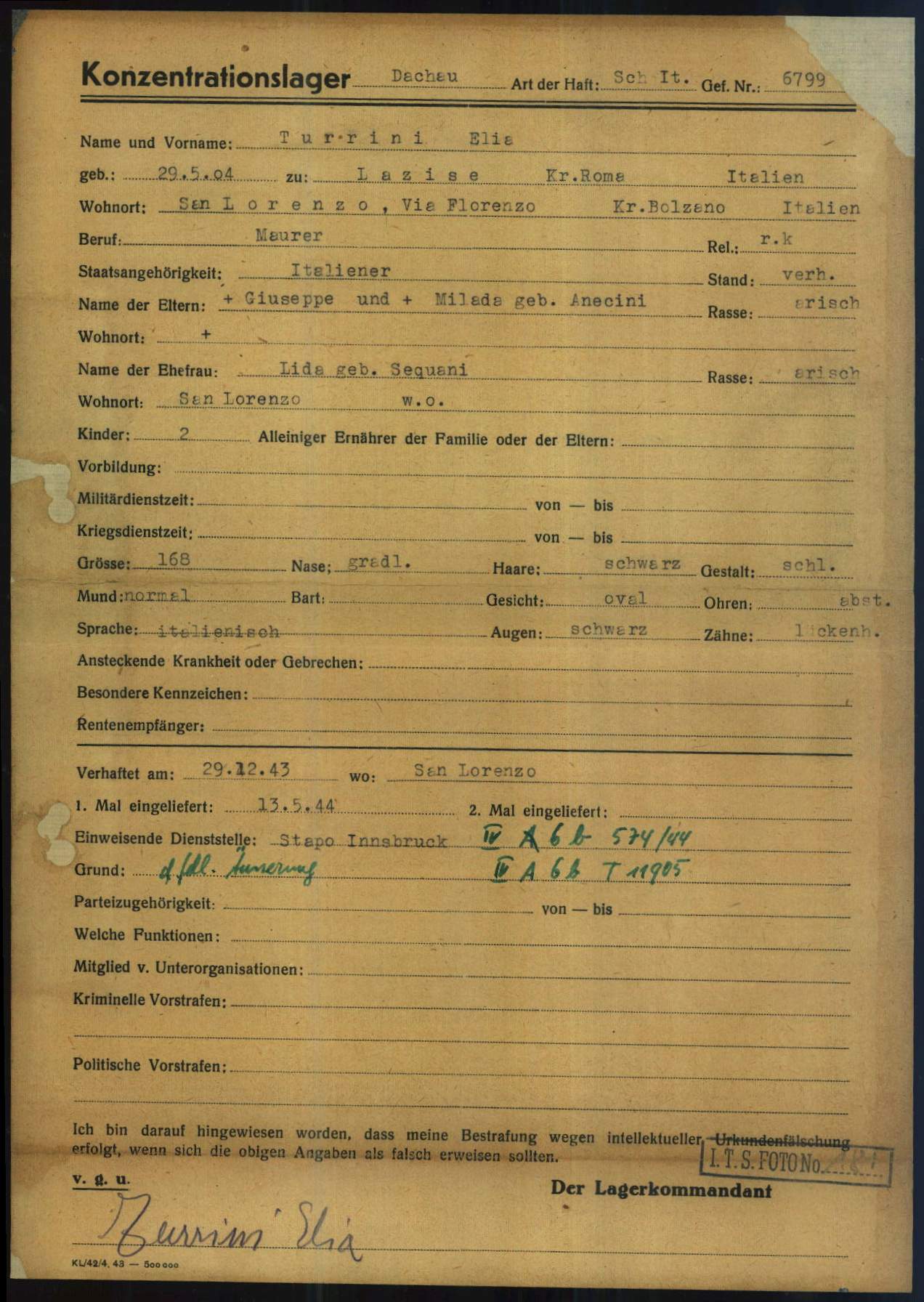 Turrini Elia, figlio di Giuseppe e Milada Anecini, nasce a Lazise (Verona) il 29 maggio 1904. Di mestiere muratore, risiede a San Lorenzo di Sebato (Bolzano), è coniugato con Lida Sequani e padre di due figli. Viene arrestato a San Lorenzo di Sebato il 29 dicembre 1943. Su disposizione della Stapo di Innsbruck – Austria – (Staatspolizei – Polizia dello Stato), viene deportato nel Campo di concentramento di Dachau. All’arrivo, il 13 maggio 1944 gli viene assegnato il numero di matricola 67994 e viene classificato come deportato per motivi precauzionali (SCH – Schutzhäftlinge). Il 9 giugno 1944 viene trasferito a Natzweiler. Viene poi trasferito a Dachau il 13 giugno 1944. Viene liberato a Dachau.