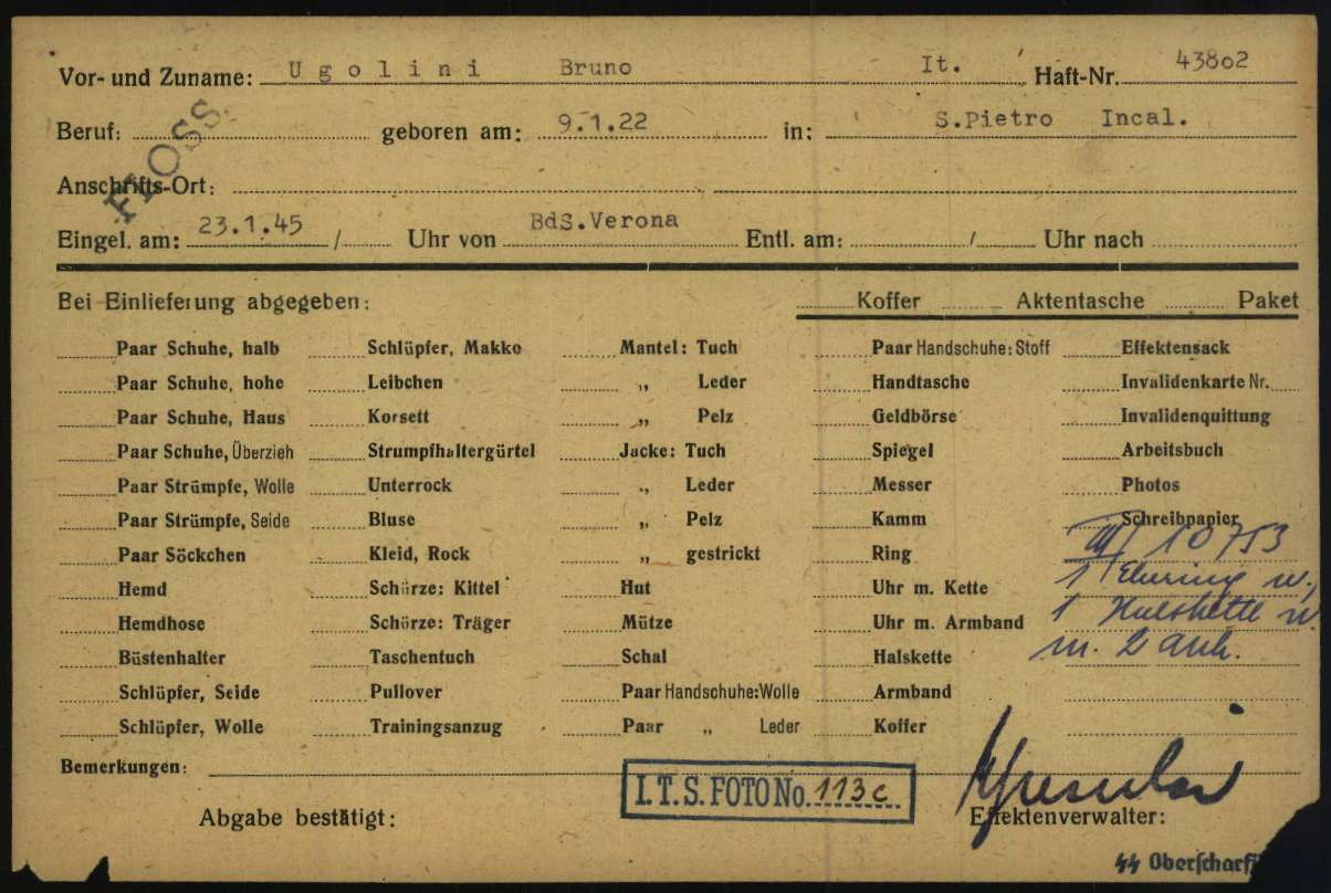 Ugolini Bruno, figlio di Andrea e Maria Faccini, nasce a San Pietro in Cariano (Verona) il 9 gennaio 1922. Di mestiere barbiere, è coniugato con Assunta Degani. Viene arrestato da soldati tedeschi l’8 dicembre 1944 a San Pietro in Cariano e detenuto presso il Palazzo INA (sede del Comando Generale SS e Polizia di Sicurezza – Befehlshaber der Sicherheitspolizei und des Sicherheitsdienst / B.d.S Italien). Viene poi trasferito nel Campo di concentramento e transito di Bolzano (Polizei – und Durchgangslager Bozen). Su disposizione del BDS di Verona (Befehlshaber der Sicherheitspolizei und des Sicherheitsdienstes – Comandante della Polizia di Sicurezza e Servizi di Sicurezza), viene deportato nel Campo di concentramento di Flossenbürg il 19 gennaio 1945 (trasporto n° 118). All’arrivo, il 23 gennaio 1945, gli viene assegnato il numero di matricola 43802 e viene classificato come deportato per motivi politici (POL – Politisch). Mestiere dichiarato all’atto dell’immatricolazione: fabbro. Il 5 febbraio 1945 viene trasferito a Ring-Saal Donau (campo satellite di Flossenbürg). Viene poi trasferito a Dachau il 9 aprile 1945, dove gli viene assegnato il numero di matricola 159879. Muore a Dachau il 24 aprile 1945.