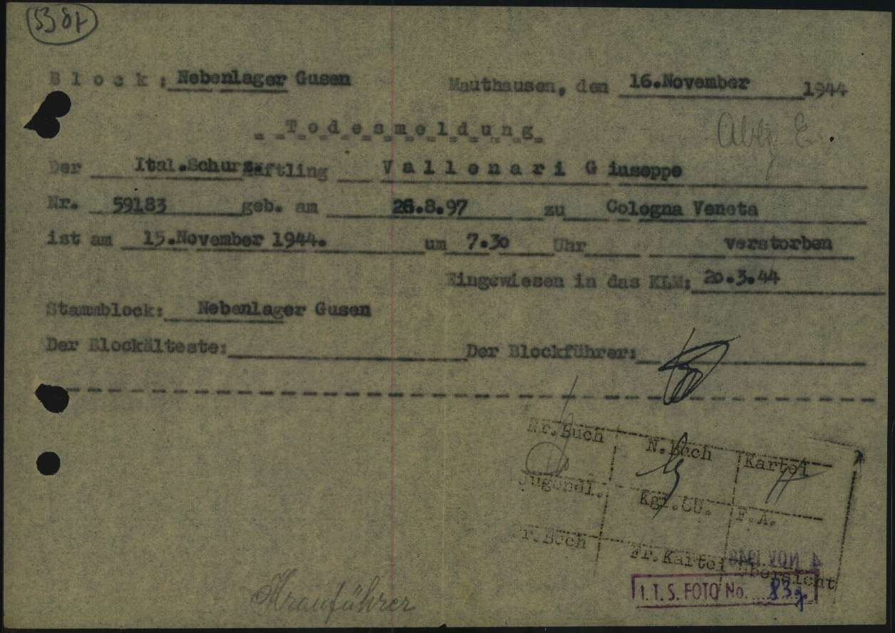 Documenti tratti da The Arolsen Archives online collections – 1822320 / Valenari Giuseppe (Mauthausen) e 1822321 / Valenari Giuseppe (Gusen).