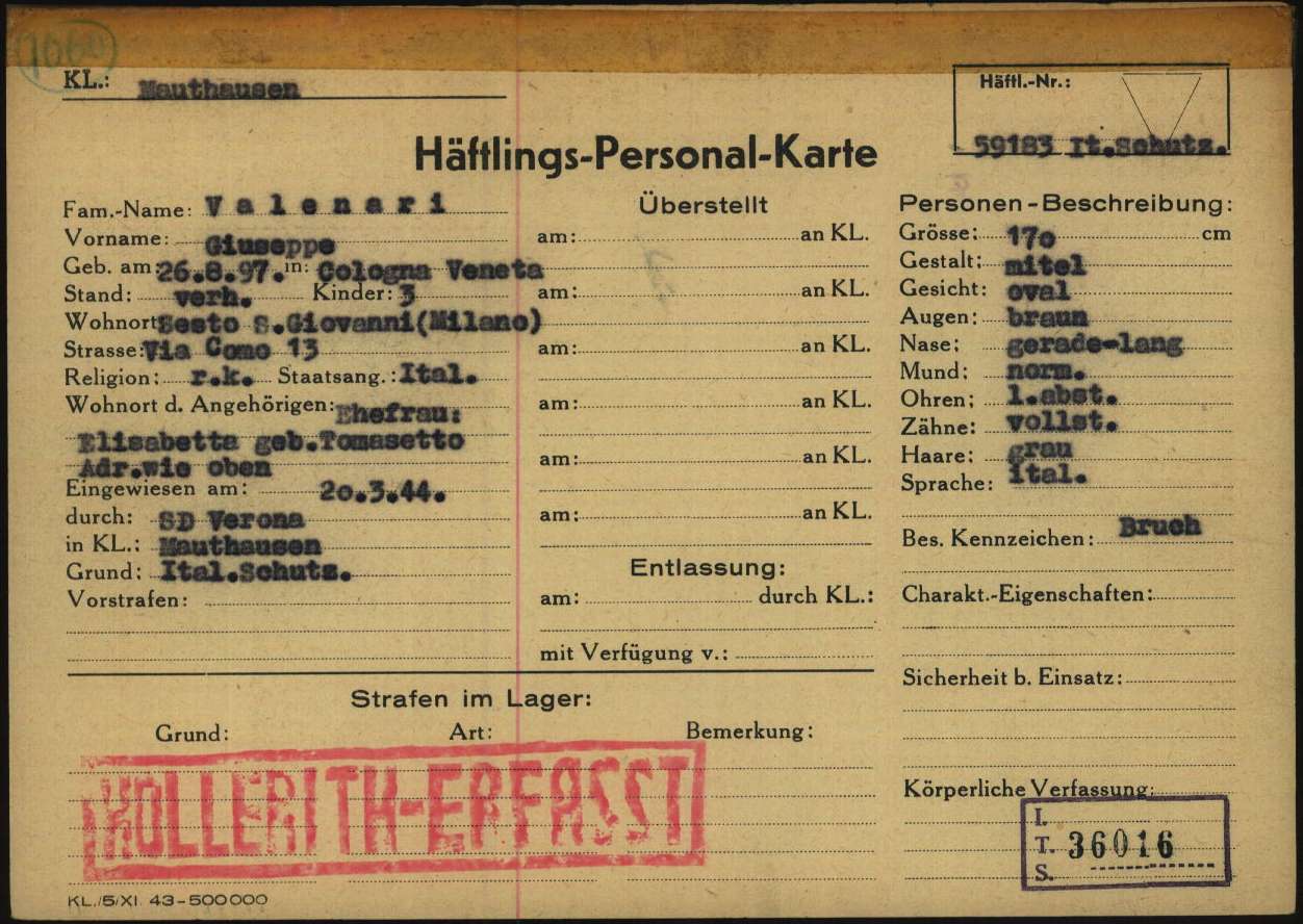 Valenari Giuseppe, figlio di Agostino e Elisa Ruffi, nasce a Cologna Veneta (Verona) il 26 agosto 1897. Di mestiere gruista, risiede a Sesto San Giovanni (Milano), è coniugato con Elisabetta Tomasetto e padre di tre figli. Viene arrestato a Sesto San Giovanni (Milano) il 14 marzo 1944 e detenuto a Milano. Su disposizione del SD di Verona (Sicherheitsdienst – Servizio di Sicurezza delle SS), viene deportato nel Campo di concentramento di Mauthausen sul convoglio partito da Bergamo il 16 marzo 1944 (trasporto n° 34). All’arrivo, il 20 marzo 1944, gli viene assegnato il numero di matricola 59183 e viene classificato come deportato per motivi precauzionali (SCH – Schutzhäftlinge). Il 24 marzo 1944, viene trasferito a Gusen (campo satellite di Mauthausen). Viene poi trasferito a Mauthausen il 26 aprile 1944. Il 7 maggio 1944, viene trasferito a Gusen (campo satellite di Mauthausen). Infine, viene ricoverato presso l’infermeria di Gusen (Revier) il 17 ottobre 1944. Muore a Gusen il 15 novembre 1944.