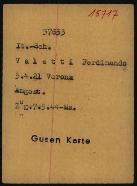 Valletti Ferdinando, nasce a Verona il 5 aprile 1921. Di mestiere impiegato privato, risiede a Milano ed è coniugato con Lidia Liva. Viene arrestato e detenuto a Milano. Su disposizione del SD di Verona (Sicherheitsdienst – Servizio di Sicurezza delle SS), viene deportato nel Campo di concentramento di Mauthausen sul convoglio partito da Milano il 4 marzo 1944. Dopo una sosta di una settimana ad Innsbruck, il convoglio riparte l’11 marzo 1944 (trasporto n° 33). All’arrivo, il 13 marzo 1944, gli viene assegnato il numero di matricola 57633 e viene classificato come deportato per motivi precauzionali (SCH – Schutzhäftlinge). Il 7 maggio 1944 viene trasferito a Gusen (campo satellite di Mauthausen). Viene poi trasferito a Gusen II (campo satellite di Mauthausen) l’11 luglio 1944. Viene ricoverato presso l’infermeria di Gusen (Revier) l’8 settembre 1944. Impiegato nelle cucine di Gusen. Viene liberato dai soldati dell’Esercito americano a Gusen il 5 maggio 1945.