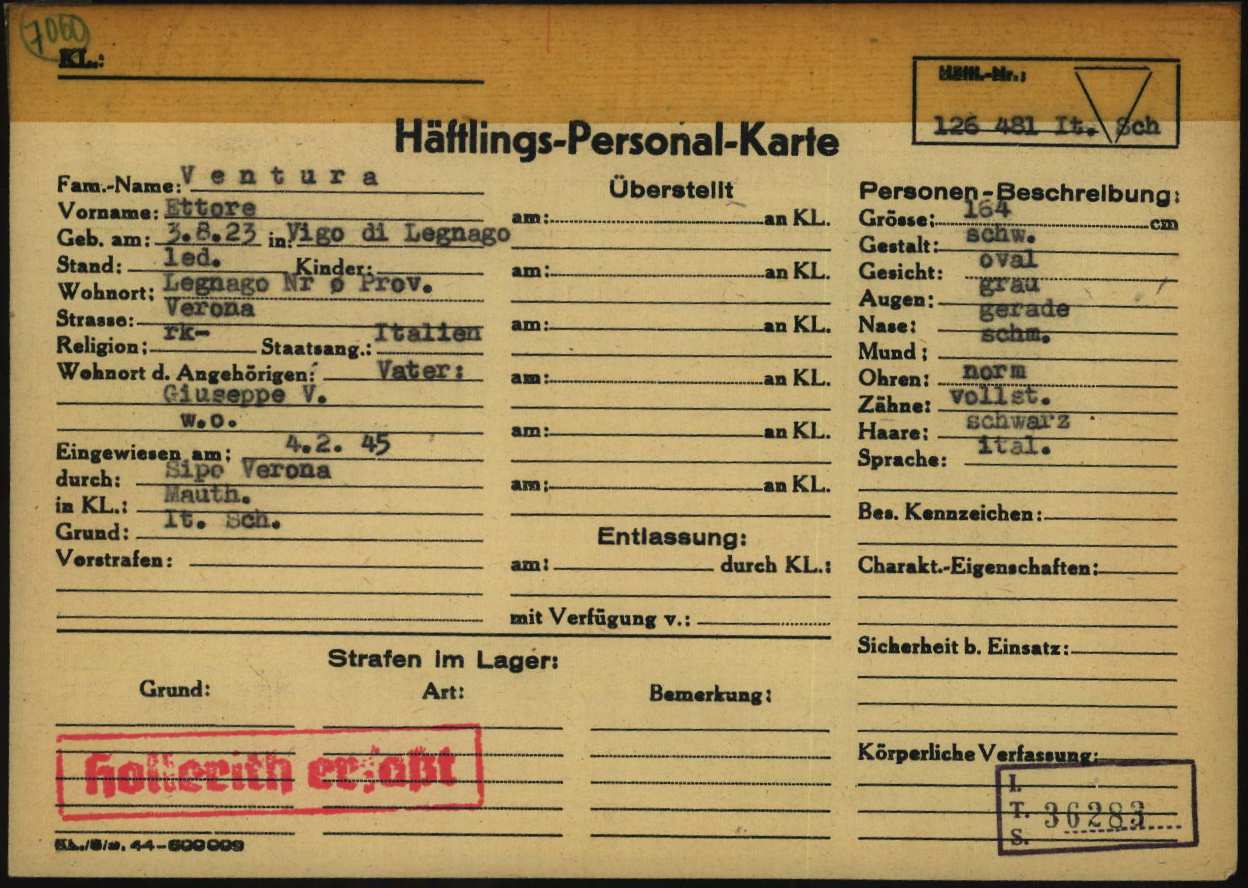 Ventura Ettore, figlio di Giuseppe ed Erminia Balso, nasce a Vigo (frazione di Legnago – Verona) il 3 agosto 1923. Di mestiere fornaio, risiede a Legnago ed è celibe. Viene arrestato dalle Brigate Nere a Vigo di Legnago il 1° dicembre 1944 e detenuto ad Angiari (Verona), a Legnago (Verona) e poi a Verona nel Forte di San Leonardo. Viene successivamente trasferito nel Campo di concentramento e transito di Bolzano (Polizei – und Durchgangslager Bozen). Su disposizione della Sipo di Verona (Sicherheitspolizei – Polizia di Sicurezza), viene deportato nel Campo di concentramento di Mauthausen il 1° febbraio 1945 (trasporto n° 119). All’arrivo, il 4 febbraio 1945, gli viene assegnato il numero di matricola 126481 e viene classificato come deportato per motivi precauzionali (SCH – Schutzhäftlinge). Il 17 febbraio 1945 viene trasferito a Gusen (campo satellite di Mauthausen). Muore a Gusen il 23 aprile 1945.