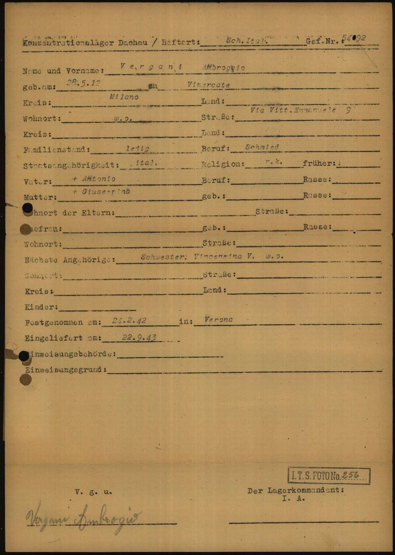 Vergani Ambrogio, nasce a Vimercate (Milano) il 28 o 30 maggio 1912. Celibe, risiede a Vimercate. Viene arrestato a Verona il 24 febbraio 1942 e detenuto nel Reclusorio militare di Peschiera del Garda (Verona). Su disposizione della Kripo di Monaco di Baviera (Kriminalpolizei – Polizia criminale), viene deportato nel Campo di concentramento di Dachau sul convoglio partito da Peschiera del Garda il 20 settembre 1943 (trasporto n° 2). All’arrivo, il 22 settembre 1943, all’arrivo gli viene assegnato il numero di matricola 54092 e viene classificato come deportato ai lavori forzati (AZR – Arbeitszwang Reich). Mestiere dichiarato all’atto dell’immatricolazione (o mestiere assegnato nel campo): fabbro. Viene trasferito a Mühldorf (campo satellite dipendente da Dachau), dove viene liberato il 28 aprile 1945.