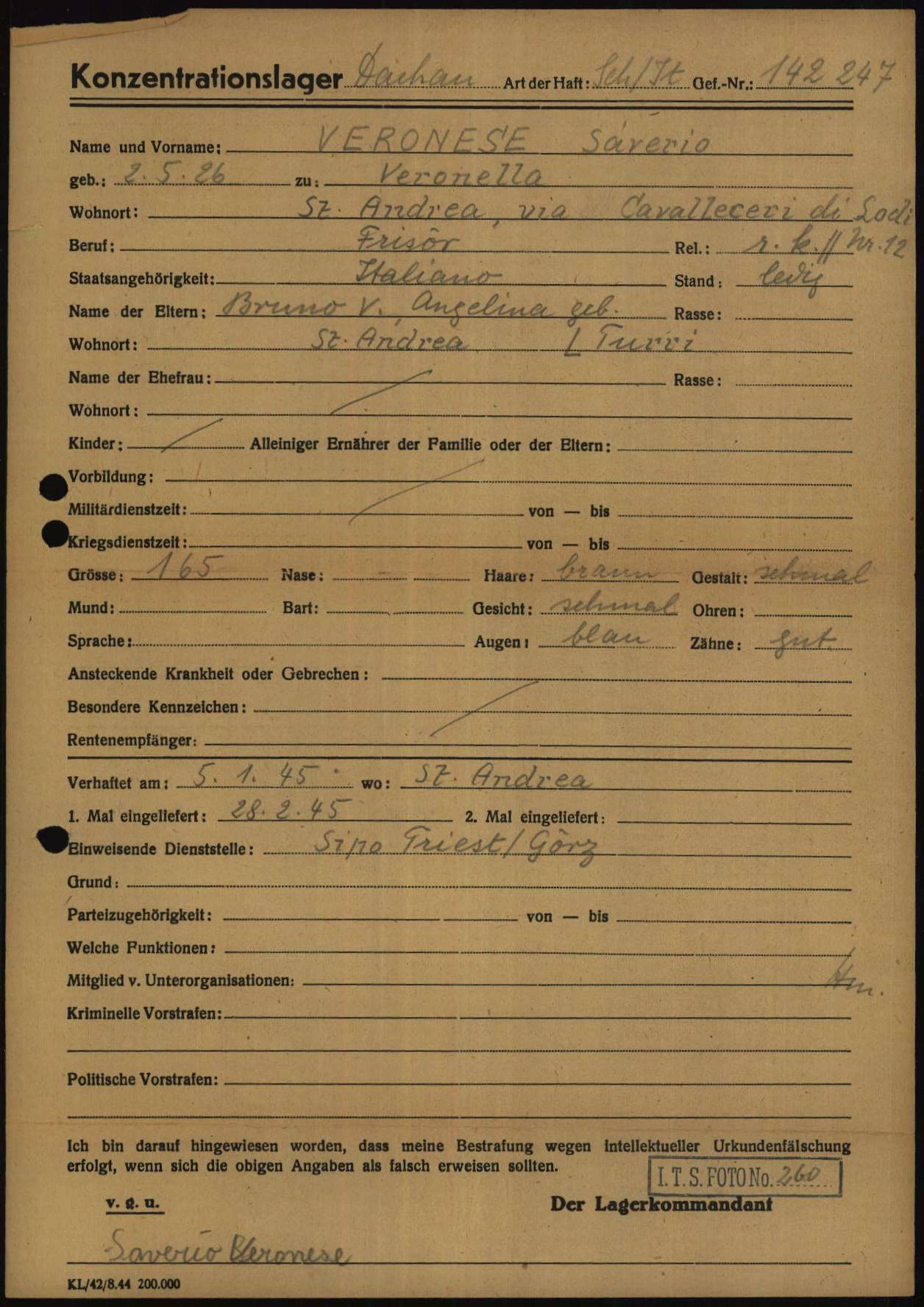 Veronese Saverio, figlio di Bruno e Angelina Turri, nasce a Veronella (Verona) il 2 maggio 1926. Di mestiere parrucchiere, risiede a Gorizia (Quartiere Sant’Andrea) ed è celibe. Viene arrestato a Gorizia / Sant’Andrea il 5 gennaio 1945. Su disposizione dalla Sipo di Trieste e Gorizia (Sicherheitspolizei – Polizia di Sicurezza), viene deportato nel Campo di concentramento di Dachau sul convoglio partito da Trieste il 24 febbraio 1945 (altri deportati furono aggiunti a Udine – trasporto n° 121). All’arrivo, il 28 febbraio 1945, gli viene assegnato il numero di matricola 142247 e viene classificato come deportato per motivi precauzionali (SCH – Schutzhäftlinge). Viene liberato a Dachau.