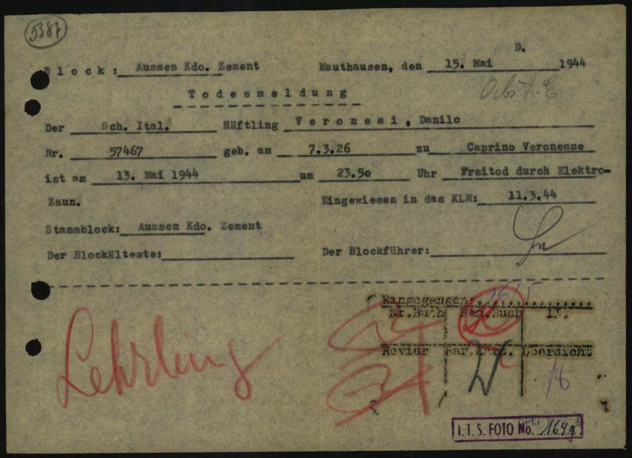 Veronesi Danilo, figlio di Adelino, nasce a Caprino Veronese (Verona) il 3 luglio 1926. Apprendista, viene arrestato a Milano per poi essere deportato nel Campo di concentramento di Mauthausen sul convoglio partito da Firenze l’8 marzo 1944 (vennero aggiunti deportati del lager di Fossoli e a Verona – trasporto n° 32). All’arrivo, l’11 marzo 1944, gli viene assegnato il numero di matricola 57467 e viene classificato come deportato per motivi precauzionali (SCH – Schutzhäftlinge). Il 12 maggio 1944 viene trasferito a Ebensee-Zement (campo satellite di Mauthausen). Muore a Ebensee il 13 maggio 1944 e viene sepolto nella stessa località in fossa comune.
