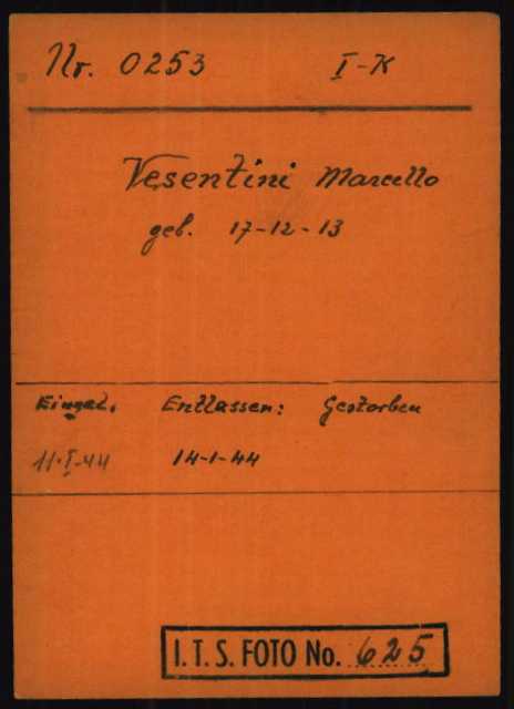 Vesentini o Visentin Marcello, figlio di Angelo e Azelia Masconale, nasce il 17 dicembre 1913 a Caldiero (Verona). Di mestiere falegname. Soldato del 3° Reggimento di Fanteria “Trento”, viene fatto prigioniero dai tedeschi a Velletri (Roma) il 9 settembre 1943 ed internato in Germania nello Stalag X B/Z di Wietzendorf (Bassa Sassonia). Viene poi deportato nel Campo di concentramento di Dora. All’arrivo, il 15 ottobre 1943, gli viene assegnato il numero di matricola 0253 e viene classificato come prigioniero di guerra (KGF – Kriegsgefangene). Viene liberato.