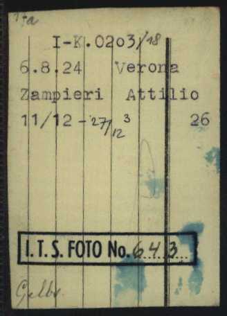 Zampieri Attilio, figlio di Giovanni, nasce a Verona il 6 agosto 1924. Soldato del 2° Reggimento Genio Alpini (Udine), viene arrestato dalle SS a Udine l’11 o 12 settembre 1943 e internato, prima nello Stalag I F di Suwałki (in tedesco Sudauen – Polonia) e poi nello Stalag XI B/Z di Bergen-Belsen. Viene successivamente deportato nel Campo di concentramento di Dora il 15 ottobre 1943. All’arrivo, gli viene assegnato il numero di matricola 0203 e viene classificato come prigioniero di guerra (KGF – Kriegsgefangene). L’11 dicembre 1944 viene ricoverato presso l’infermeria di Dora (Revier) e dimesso il 27 dicembre 1944. Viene liberato a Bergen Belsen il 14 aprile 1945 e rimpatriato l’11 settembre 1945.