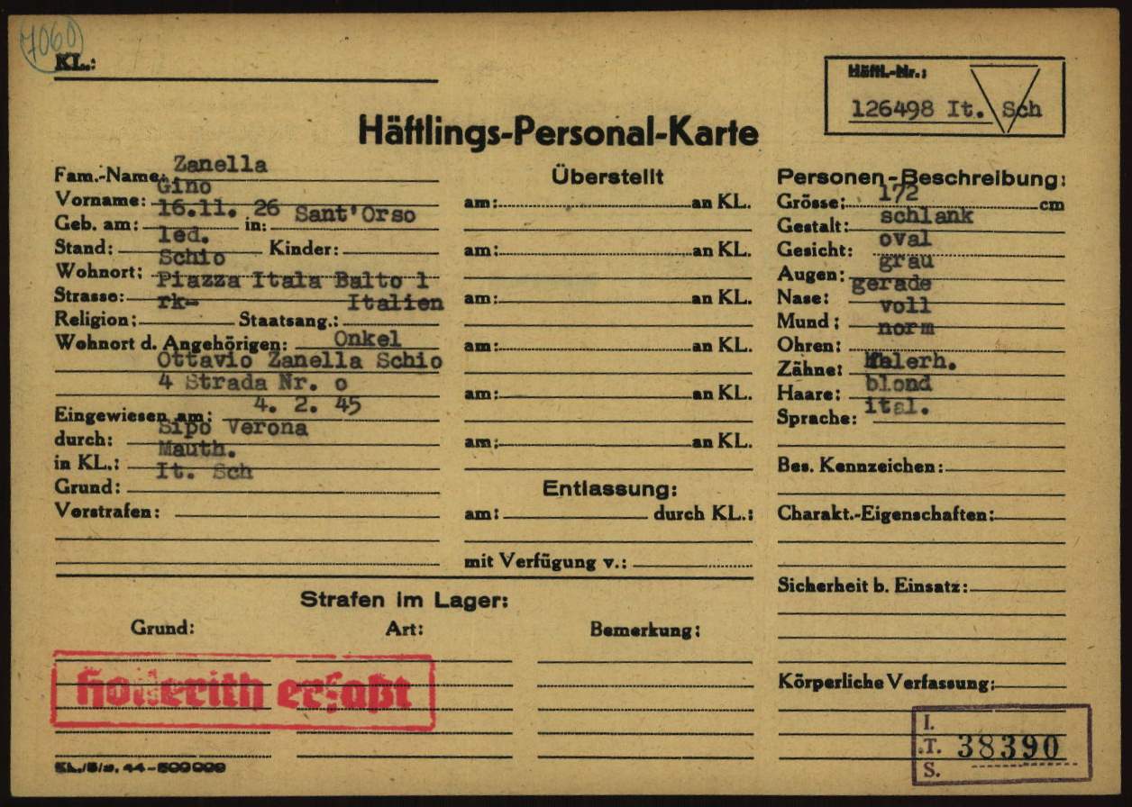 Zanella Gino, figlio di Giacinto, nasce a Santorso (Vicenza) il 16 novembre 1926. Di mestiere meccanico, risiede a Schio (Vicenza) ed è celibe. Viene arrestato a Verona e poi trasferito nel Campo di concentramento e transito di Bolzano (Polizei – und Durchgangslager Bozen) con il numero di matricola 8135. Viene assegnato al Blocco celle. Su disposizione della Sipo di Verona (Sicherheitspolizei – Polizia di Sicurezza), viene deportato nel Campo di concentramento di Mauthausen il 1° febbraio 1945 (trasporto n° 119). All’arrivo, il 4 febbraio 1945, gli viene assegnato il numero di matricola 126498 e viene classificato come deportato per motivi precauzionali (SCH – Schutzhäftlinge). Il 16 febbraio 1945, viene trasferito a Gusen (campo satellite di Mauthausen). Muore a Gusen il 25 aprile 1945 e viene sepolto nella stessa località in fossa comune.